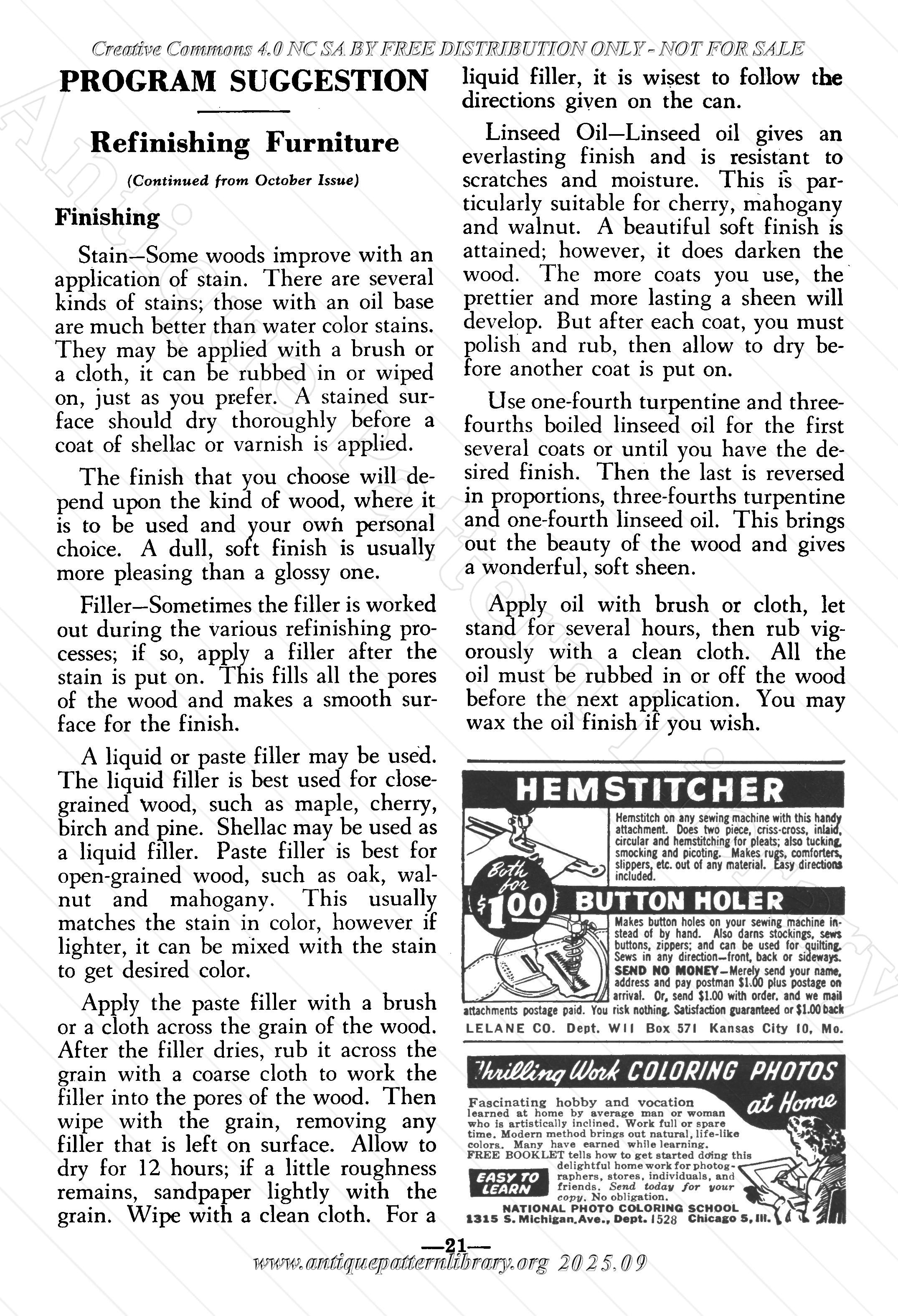 Crocheted Tablecloth in Grape Leaf Pattern, Knitted Bag, Lacy Crocheted Apron, Cake Builder, Aunt Ellen's Club Notes, Refinishing Furniture, Miss Jennie's Pumpkin Pie, Cooking Hints, Cane Seat Weaving, Mittens in Fair Isle Knitting, Tatted Edging and Insertion, Lacy Doily, Child's Sweater in Crocheting, Spoke Pan Holder, Book reviews.