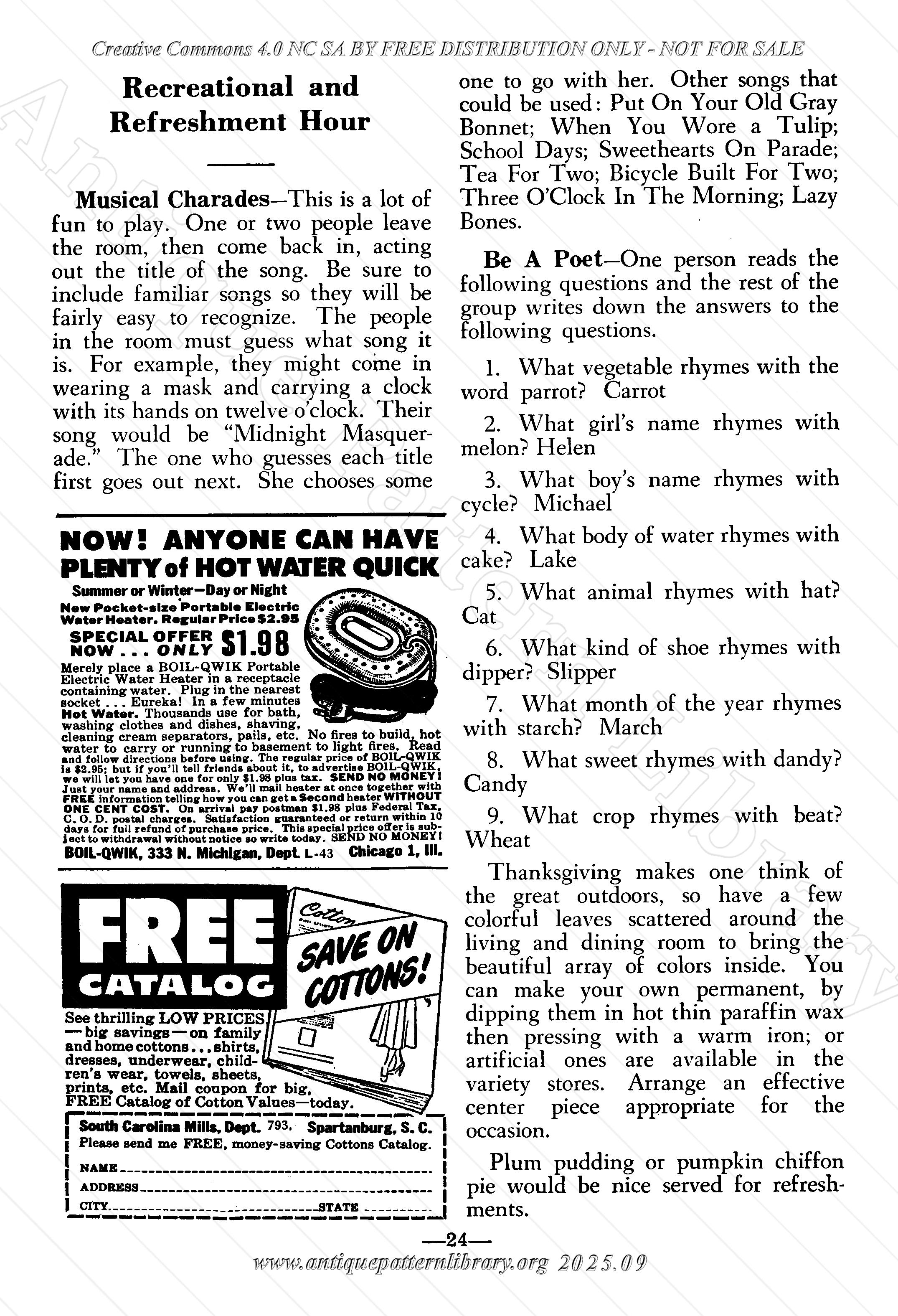 Crocheted Tablecloth in Grape Leaf Pattern, Knitted Bag, Lacy Crocheted Apron, Cake Builder, Aunt Ellen's Club Notes, Refinishing Furniture, Miss Jennie's Pumpkin Pie, Cooking Hints, Cane Seat Weaving, Mittens in Fair Isle Knitting, Tatted Edging and Insertion, Lacy Doily, Child's Sweater in Crocheting, Spoke Pan Holder, Book reviews.