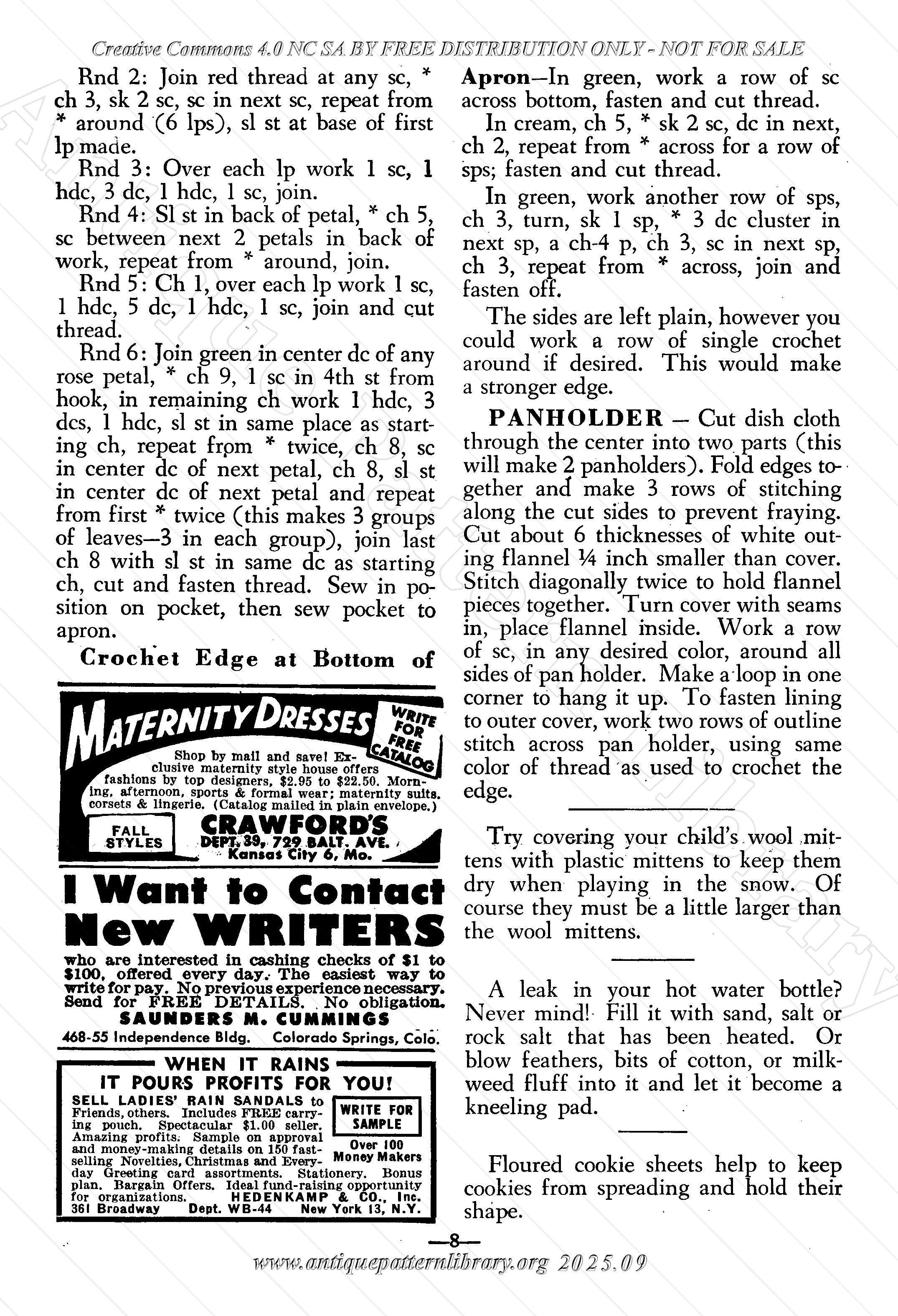 Hairpin lace: Vanity set with large and small doily. Huck weaving on towel. Crochet: Apron and matching pan holder. Figurine painting, Women who make cents (articles to sell), Aunt Ellen's Club Notes with a banana nut bread receipe, Pumpkin Cake, Creamy Caramel Icing, Green Tomato Relish, Orange Pudding, Popcorn Balls. Crochet: Pinwheel Pan Holder. Home and Garden forum tips. Waffle Pique Embroidery, Crocheted Teddy Bear, crocheted Rose Pin Cushion with Ruffle, Basket making, Halloween Clown doll, Lilac Square Tatting. Quilting: Colonial Rose Quilt, Crocheted Scarf.