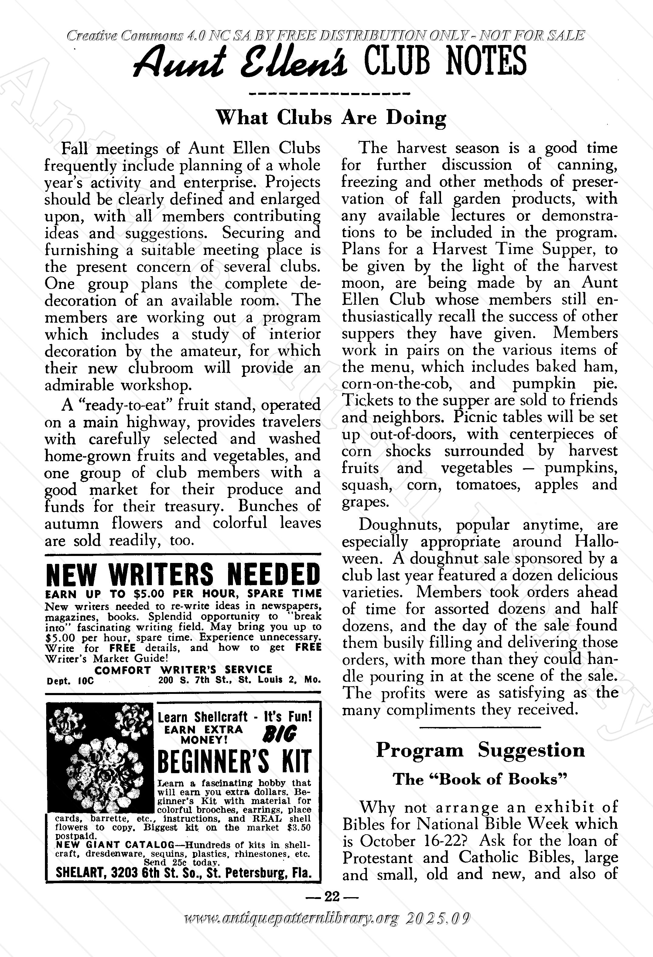 Hairpin lace: Vanity set with large and small doily. Huck weaving on towel. Crochet: Apron and matching pan holder. Figurine painting, Women who make cents (articles to sell), Aunt Ellen's Club Notes with a banana nut bread receipe, Pumpkin Cake, Creamy Caramel Icing, Green Tomato Relish, Orange Pudding, Popcorn Balls. Crochet: Pinwheel Pan Holder. Home and Garden forum tips. Waffle Pique Embroidery, Crocheted Teddy Bear, crocheted Rose Pin Cushion with Ruffle, Basket making, Halloween Clown doll, Lilac Square Tatting. Quilting: Colonial Rose Quilt, Crocheted Scarf.