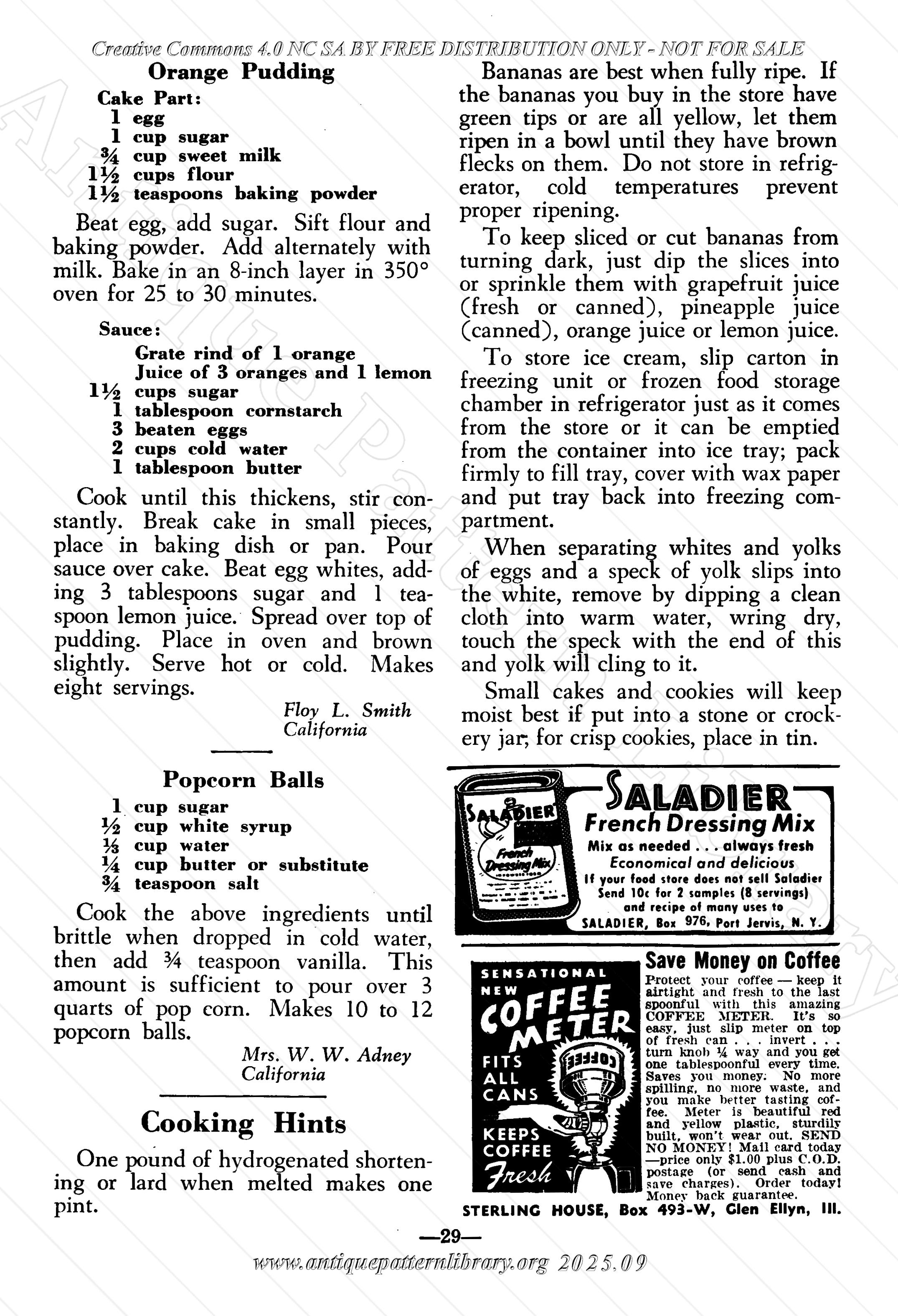 Hairpin lace: Vanity set with large and small doily. Huck weaving on towel. Crochet: Apron and matching pan holder. Figurine painting, Women who make cents (articles to sell), Aunt Ellen's Club Notes with a banana nut bread receipe, Pumpkin Cake, Creamy Caramel Icing, Green Tomato Relish, Orange Pudding, Popcorn Balls. Crochet: Pinwheel Pan Holder. Home and Garden forum tips. Waffle Pique Embroidery, Crocheted Teddy Bear, crocheted Rose Pin Cushion with Ruffle, Basket making, Halloween Clown doll, Lilac Square Tatting. Quilting: Colonial Rose Quilt, Crocheted Scarf.