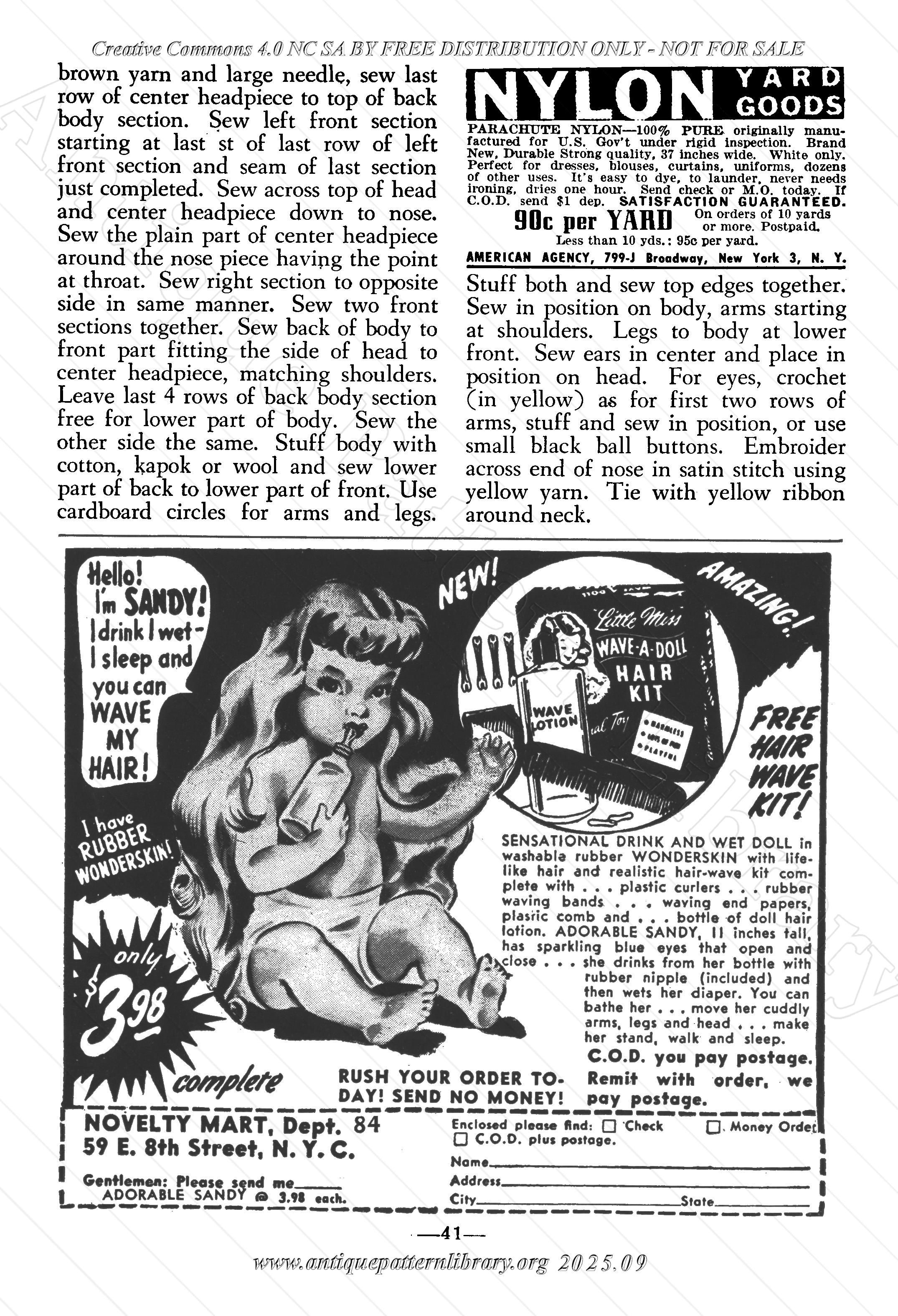 Hairpin lace: Vanity set with large and small doily. Huck weaving on towel. Crochet: Apron and matching pan holder. Figurine painting, Women who make cents (articles to sell), Aunt Ellen's Club Notes with a banana nut bread receipe, Pumpkin Cake, Creamy Caramel Icing, Green Tomato Relish, Orange Pudding, Popcorn Balls. Crochet: Pinwheel Pan Holder. Home and Garden forum tips. Waffle Pique Embroidery, Crocheted Teddy Bear, crocheted Rose Pin Cushion with Ruffle, Basket making, Halloween Clown doll, Lilac Square Tatting. Quilting: Colonial Rose Quilt, Crocheted Scarf.