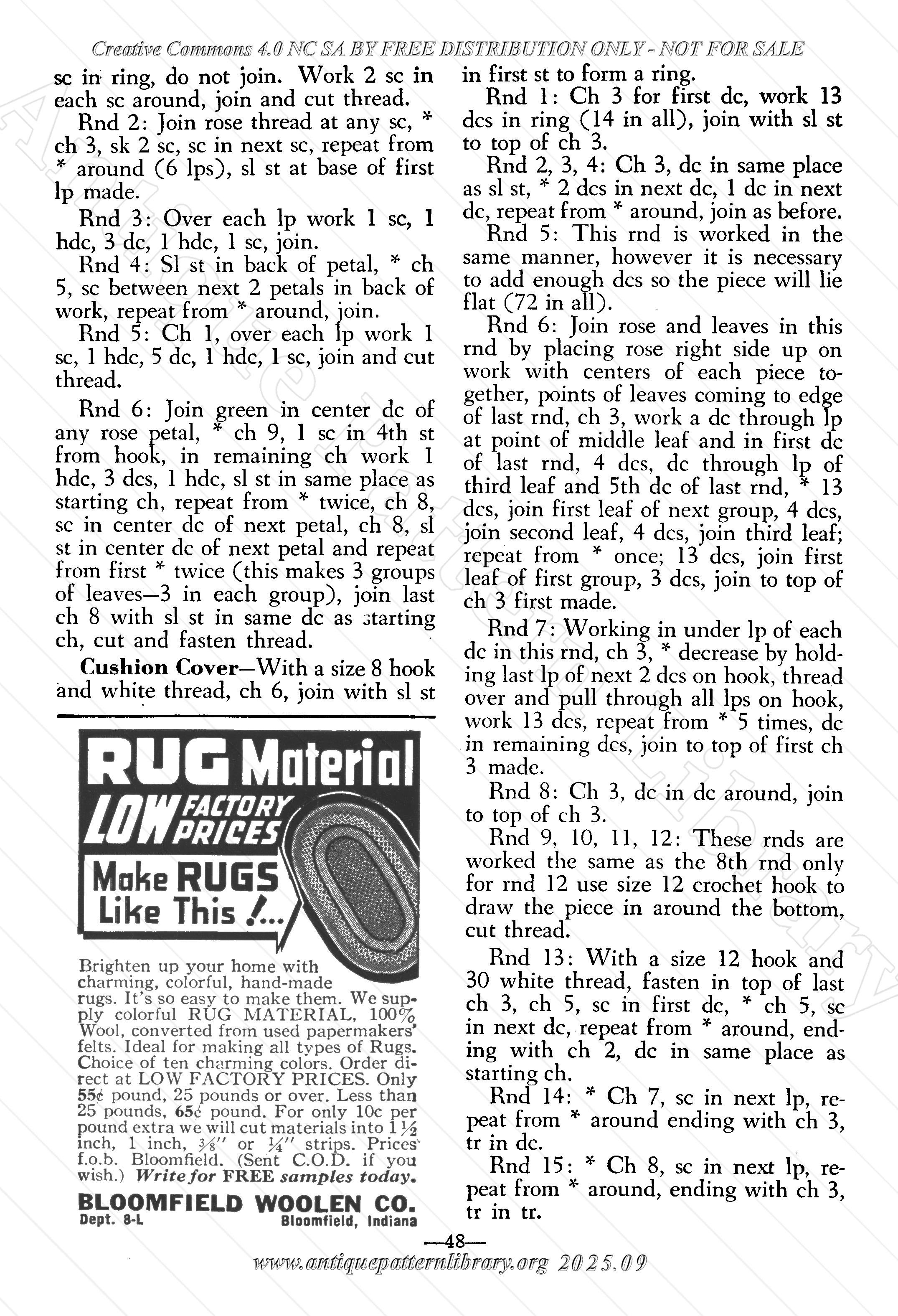 Hairpin lace: Vanity set with large and small doily. Huck weaving on towel. Crochet: Apron and matching pan holder. Figurine painting, Women who make cents (articles to sell), Aunt Ellen's Club Notes with a banana nut bread receipe, Pumpkin Cake, Creamy Caramel Icing, Green Tomato Relish, Orange Pudding, Popcorn Balls. Crochet: Pinwheel Pan Holder. Home and Garden forum tips. Waffle Pique Embroidery, Crocheted Teddy Bear, crocheted Rose Pin Cushion with Ruffle, Basket making, Halloween Clown doll, Lilac Square Tatting. Quilting: Colonial Rose Quilt, Crocheted Scarf.