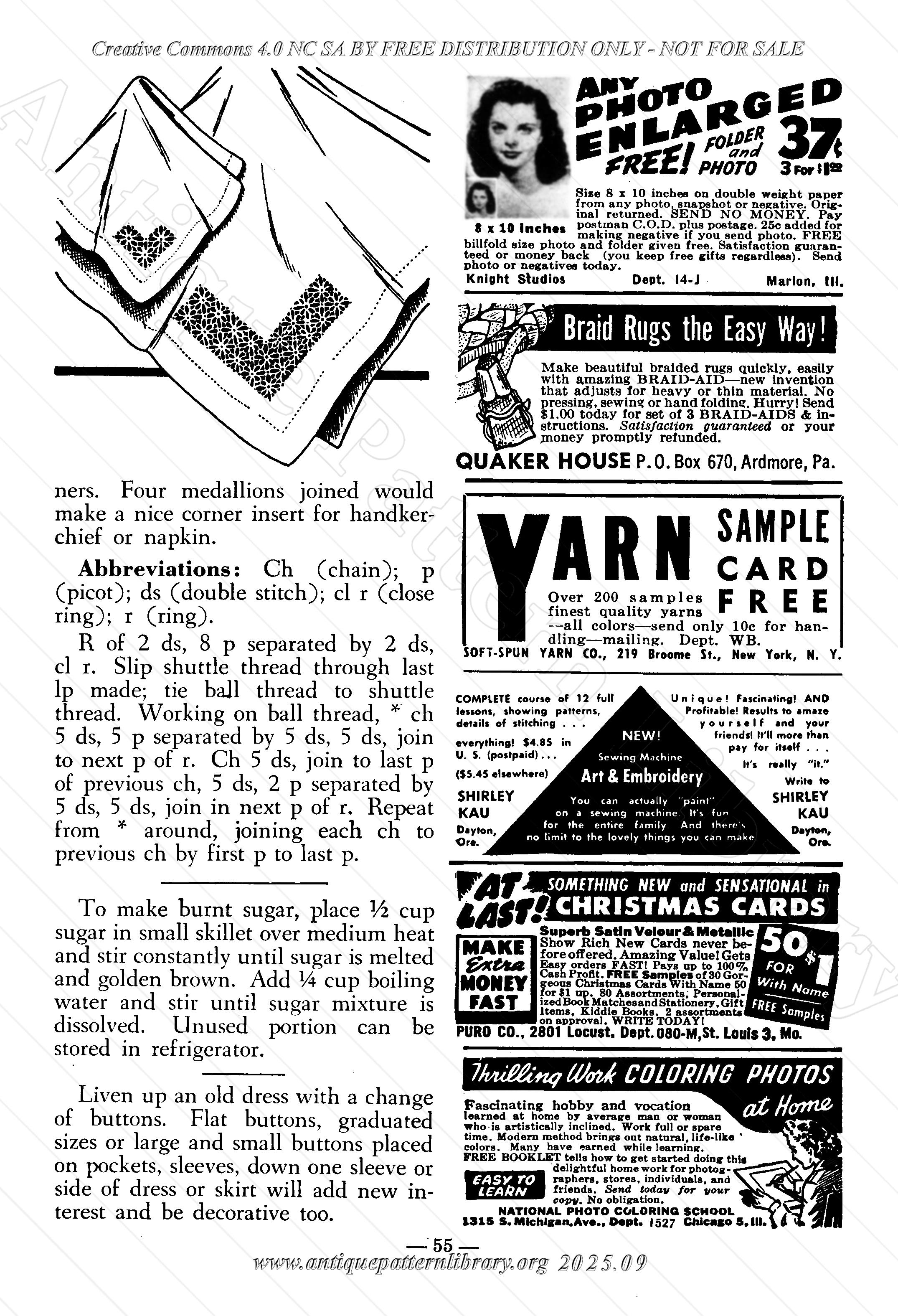 Hairpin lace: Vanity set with large and small doily. Huck weaving on towel. Crochet: Apron and matching pan holder. Figurine painting, Women who make cents (articles to sell), Aunt Ellen's Club Notes with a banana nut bread receipe, Pumpkin Cake, Creamy Caramel Icing, Green Tomato Relish, Orange Pudding, Popcorn Balls. Crochet: Pinwheel Pan Holder. Home and Garden forum tips. Waffle Pique Embroidery, Crocheted Teddy Bear, crocheted Rose Pin Cushion with Ruffle, Basket making, Halloween Clown doll, Lilac Square Tatting. Quilting: Colonial Rose Quilt, Crocheted Scarf.