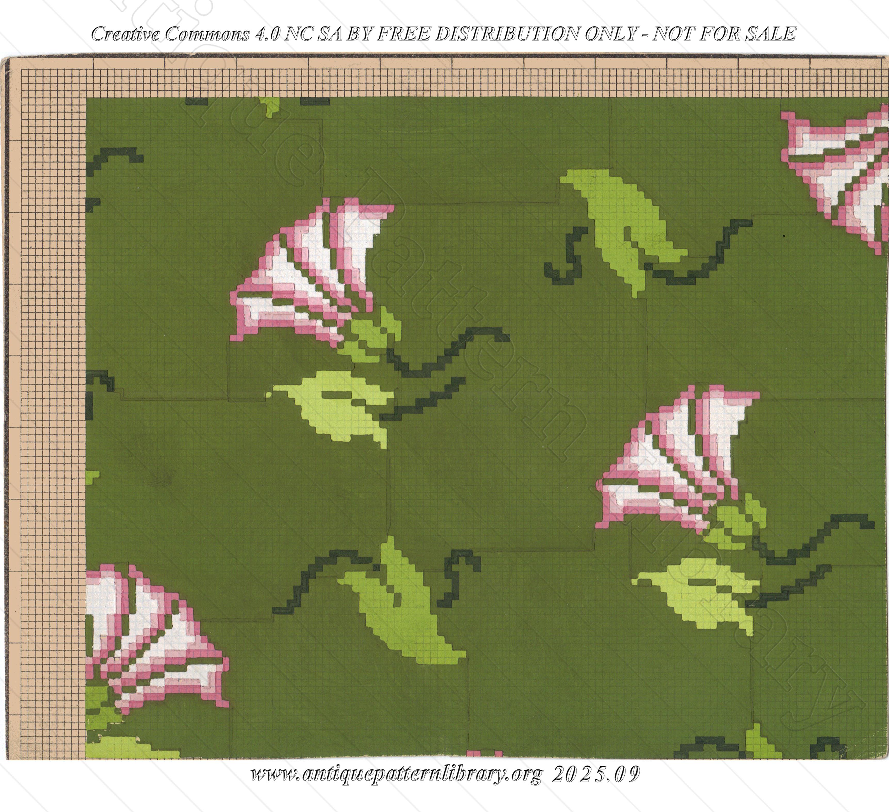 Fragment of a Berlin woolwork pattern. Repeating pattern of hedge bindweed (Calystegia sepium) flowers and leaves.