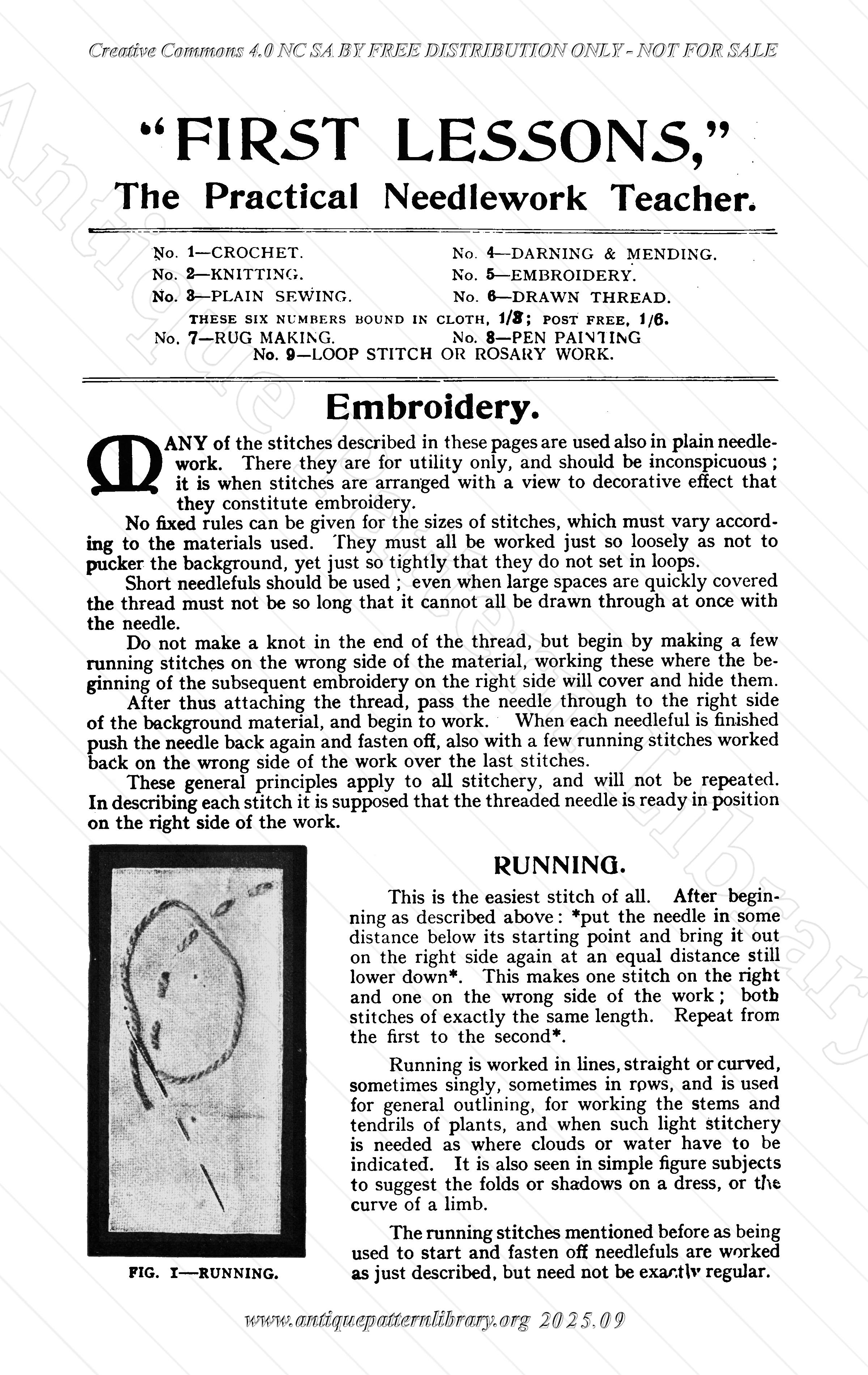 No. 5 in a series of "First Lessons", The Practical Needlework Teacher. Explanations and photos of various embroidery stitches. Running stitch, Darning, Back Stitching, Twisted Back Stitching, Back Stitch and Rice Stitch, Crewel Stitch, Outline Stitch, Couching, Cross Stitch, Chain Stitch, Picot Stitch, Herringbone Stitch, Coral or Feather Stitch, Fancy Coral Stitch, Close Buttonholing, Spaced Buttonholing, Scalloped Buttonholing, Satin Stitch, Long and Short Stitch as an Outlining, Long and Short Stitch as a Filling, Oriental Stitch, and French Knots.
