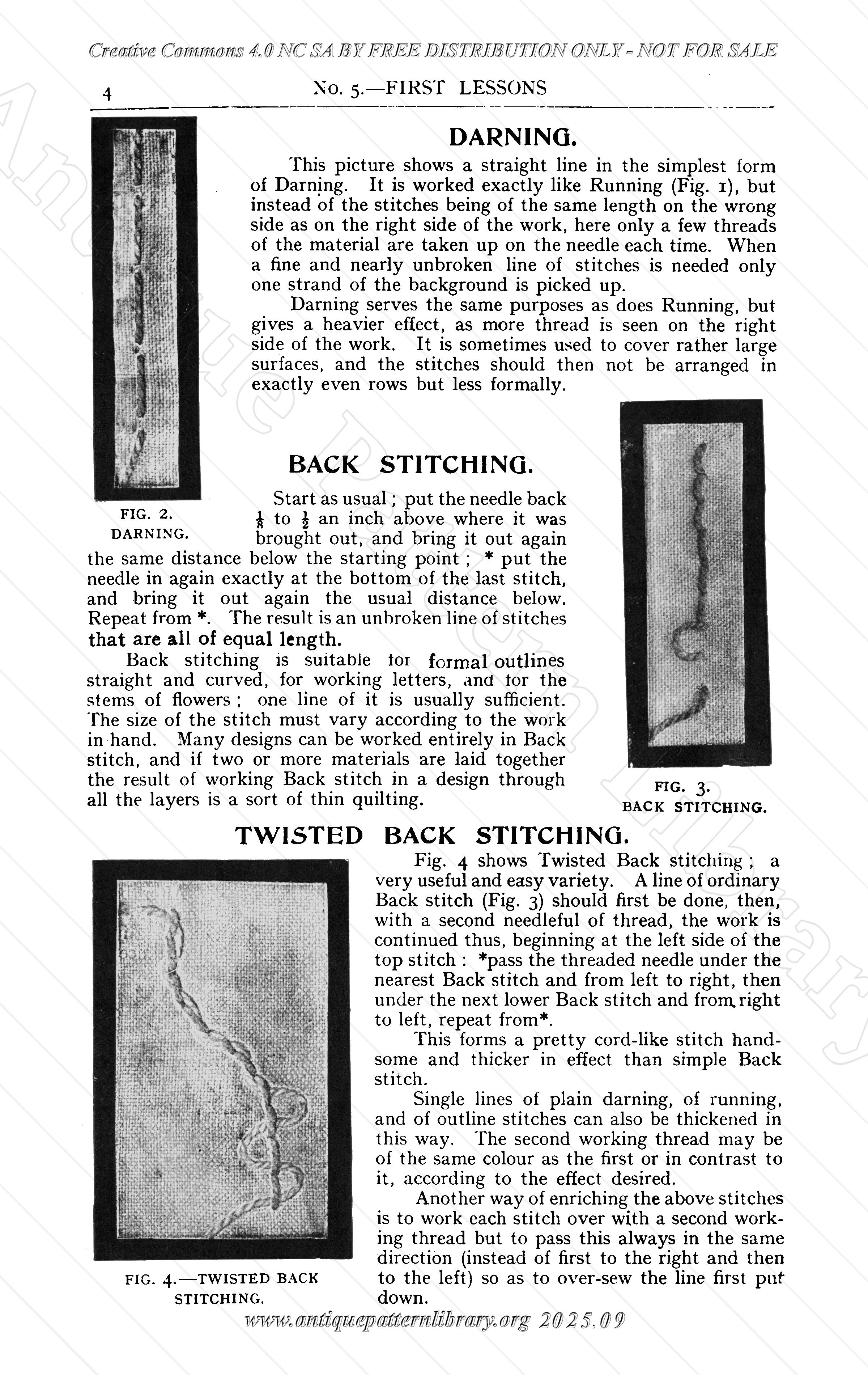 No. 5 in a series of "First Lessons", The Practical Needlework Teacher. Explanations and photos of various embroidery stitches. Running stitch, Darning, Back Stitching, Twisted Back Stitching, Back Stitch and Rice Stitch, Crewel Stitch, Outline Stitch, Couching, Cross Stitch, Chain Stitch, Picot Stitch, Herringbone Stitch, Coral or Feather Stitch, Fancy Coral Stitch, Close Buttonholing, Spaced Buttonholing, Scalloped Buttonholing, Satin Stitch, Long and Short Stitch as an Outlining, Long and Short Stitch as a Filling, Oriental Stitch, and French Knots.