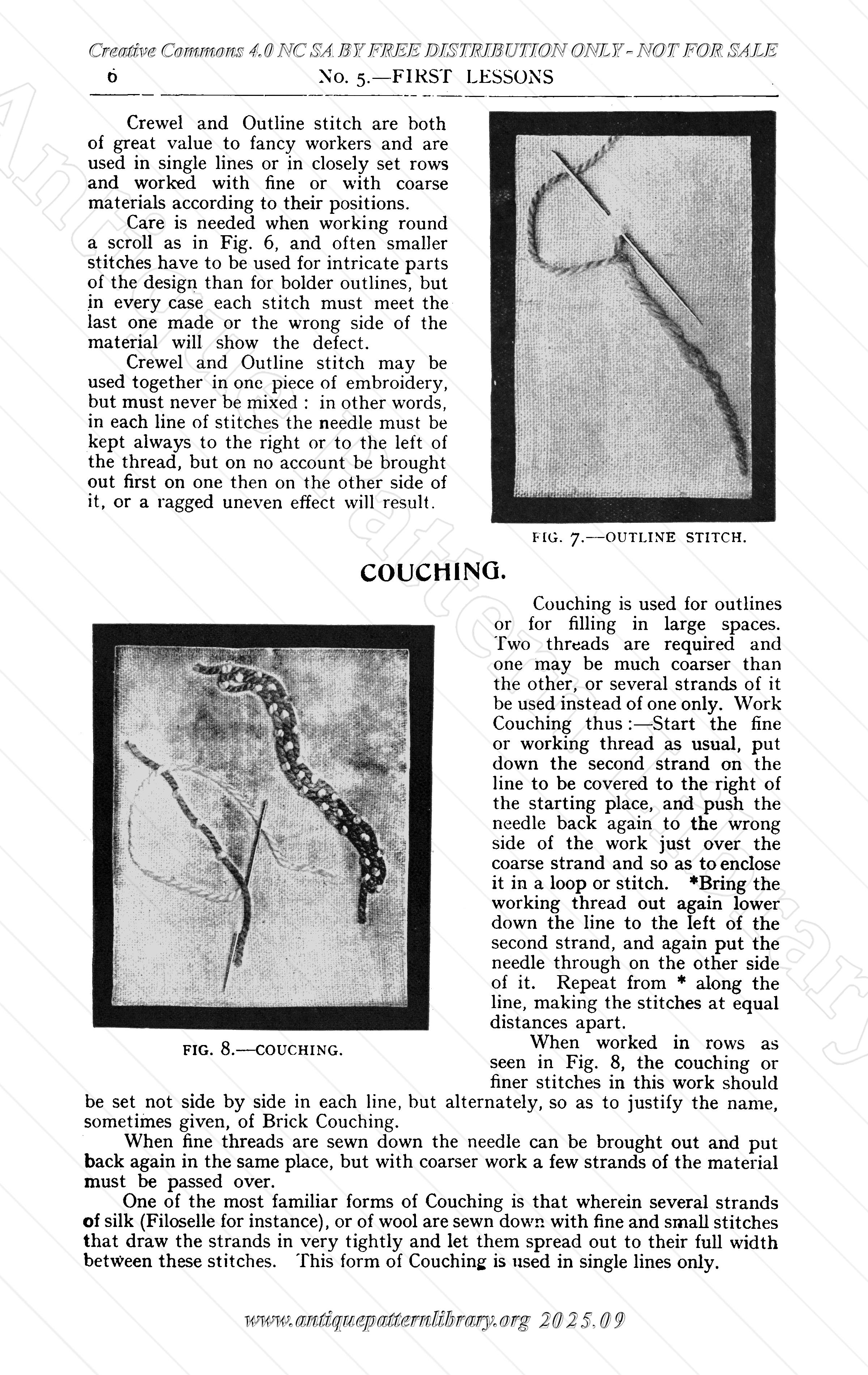 No. 5 in a series of "First Lessons", The Practical Needlework Teacher. Explanations and photos of various embroidery stitches. Running stitch, Darning, Back Stitching, Twisted Back Stitching, Back Stitch and Rice Stitch, Crewel Stitch, Outline Stitch, Couching, Cross Stitch, Chain Stitch, Picot Stitch, Herringbone Stitch, Coral or Feather Stitch, Fancy Coral Stitch, Close Buttonholing, Spaced Buttonholing, Scalloped Buttonholing, Satin Stitch, Long and Short Stitch as an Outlining, Long and Short Stitch as a Filling, Oriental Stitch, and French Knots.