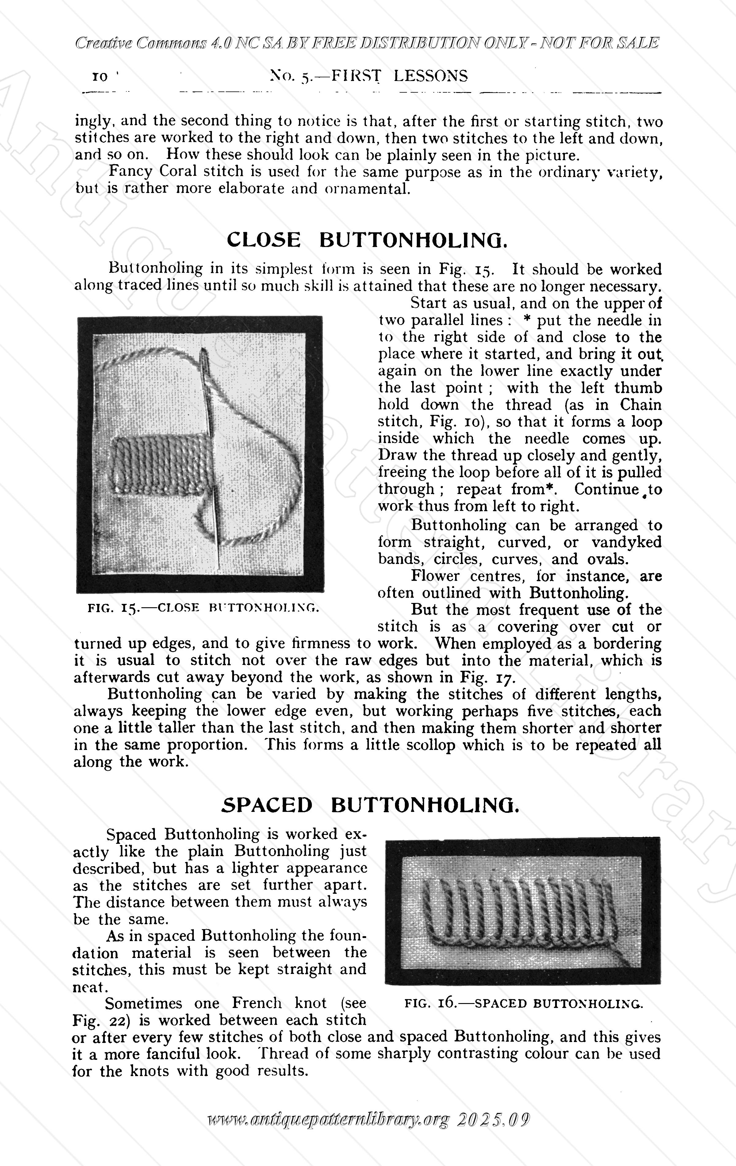No. 5 in a series of "First Lessons", The Practical Needlework Teacher. Explanations and photos of various embroidery stitches. Running stitch, Darning, Back Stitching, Twisted Back Stitching, Back Stitch and Rice Stitch, Crewel Stitch, Outline Stitch, Couching, Cross Stitch, Chain Stitch, Picot Stitch, Herringbone Stitch, Coral or Feather Stitch, Fancy Coral Stitch, Close Buttonholing, Spaced Buttonholing, Scalloped Buttonholing, Satin Stitch, Long and Short Stitch as an Outlining, Long and Short Stitch as a Filling, Oriental Stitch, and French Knots.