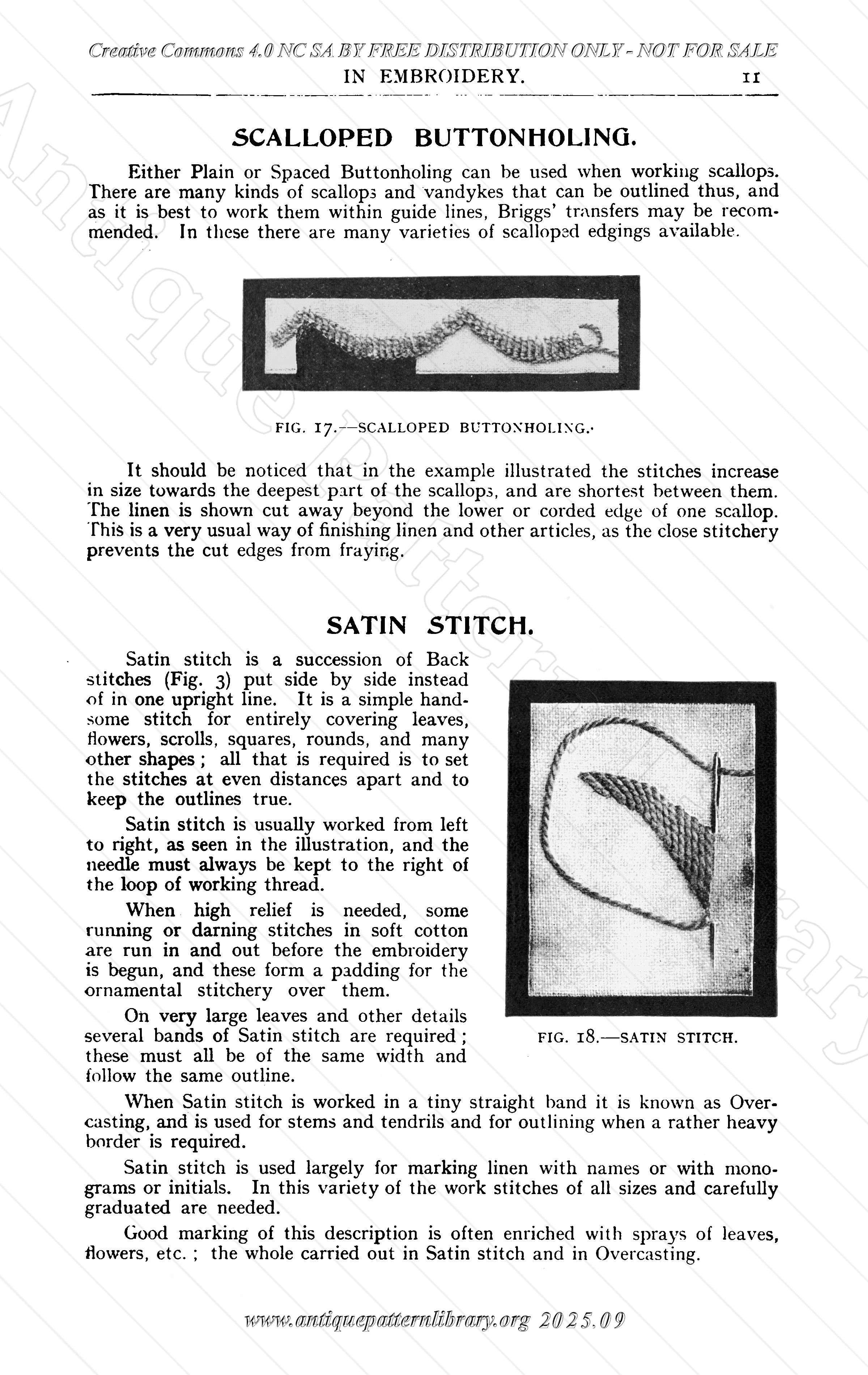 No. 5 in a series of "First Lessons", The Practical Needlework Teacher. Explanations and photos of various embroidery stitches. Running stitch, Darning, Back Stitching, Twisted Back Stitching, Back Stitch and Rice Stitch, Crewel Stitch, Outline Stitch, Couching, Cross Stitch, Chain Stitch, Picot Stitch, Herringbone Stitch, Coral or Feather Stitch, Fancy Coral Stitch, Close Buttonholing, Spaced Buttonholing, Scalloped Buttonholing, Satin Stitch, Long and Short Stitch as an Outlining, Long and Short Stitch as a Filling, Oriental Stitch, and French Knots.