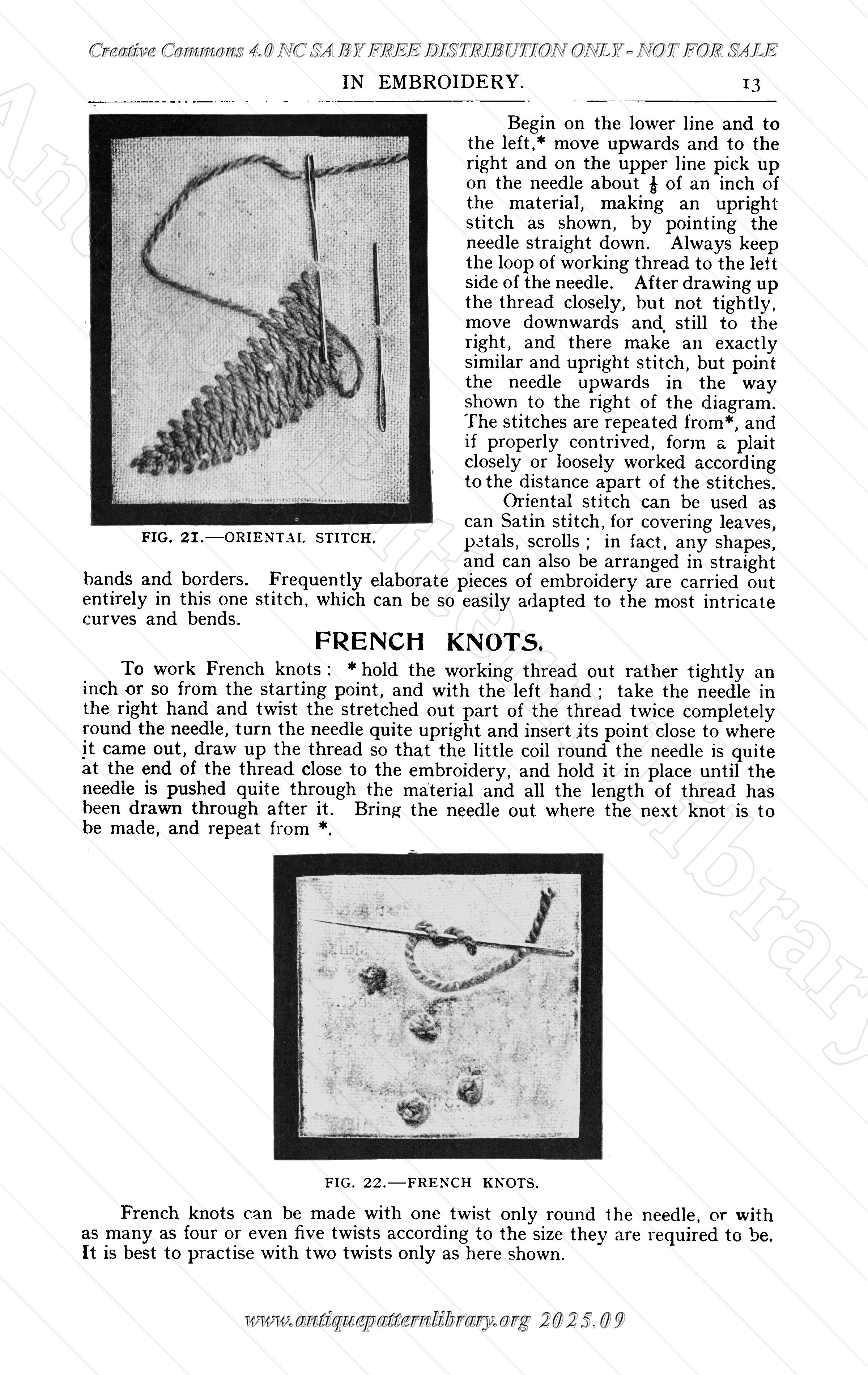 No. 5 in a series of "First Lessons", The Practical Needlework Teacher. Explanations and photos of various embroidery stitches. Running stitch, Darning, Back Stitching, Twisted Back Stitching, Back Stitch and Rice Stitch, Crewel Stitch, Outline Stitch, Couching, Cross Stitch, Chain Stitch, Picot Stitch, Herringbone Stitch, Coral or Feather Stitch, Fancy Coral Stitch, Close Buttonholing, Spaced Buttonholing, Scalloped Buttonholing, Satin Stitch, Long and Short Stitch as an Outlining, Long and Short Stitch as a Filling, Oriental Stitch, and French Knots.