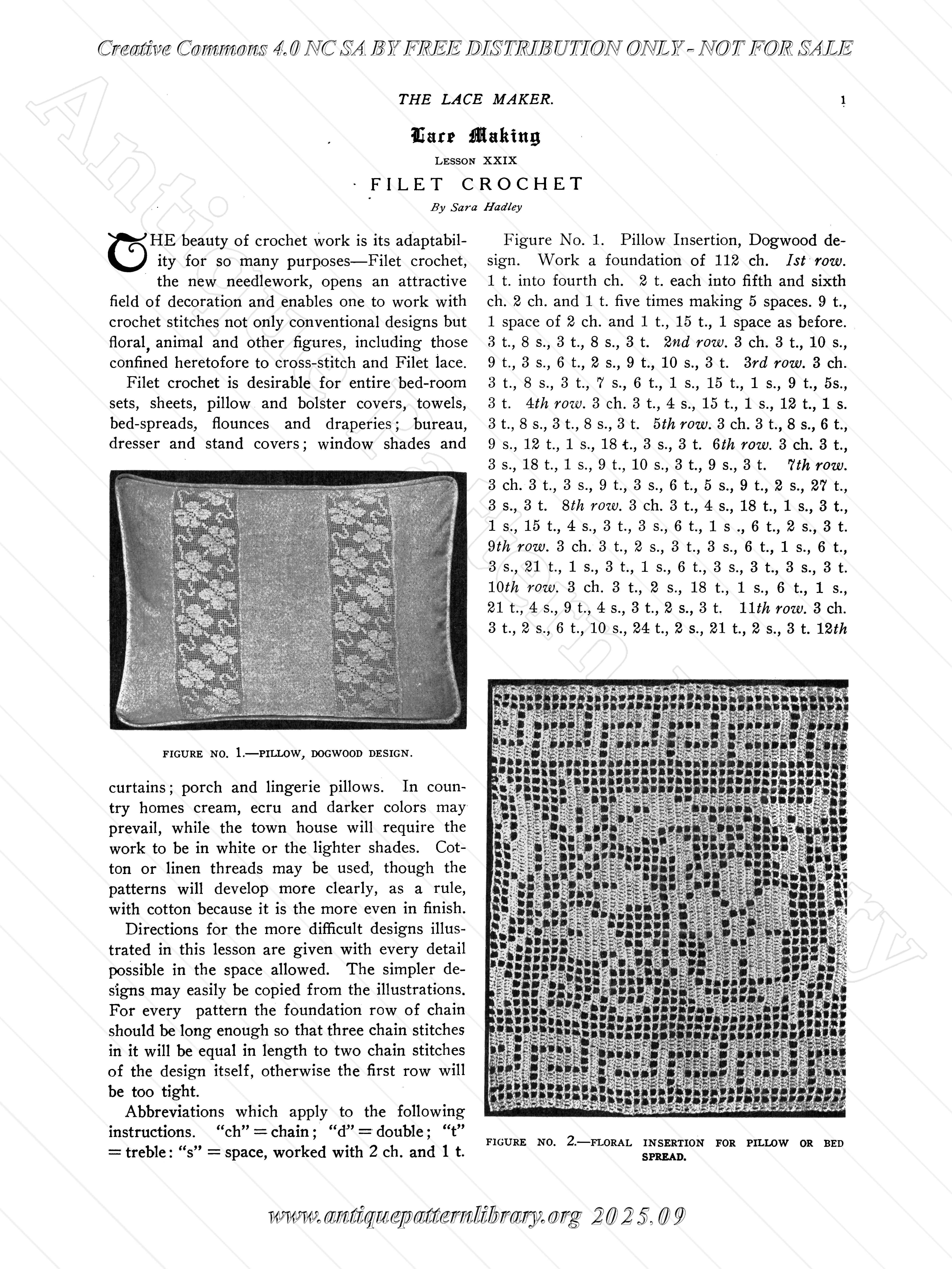 Introduction in Filet Crochet work, though not a basic how-to. Photographs of filet crochet work with the description of the patterns side by side. Mostly small motifs and narrow edgings, some corners and a few larger items. This publication dates from 1911, which is why not all patterns would be appropriate in modern publications.