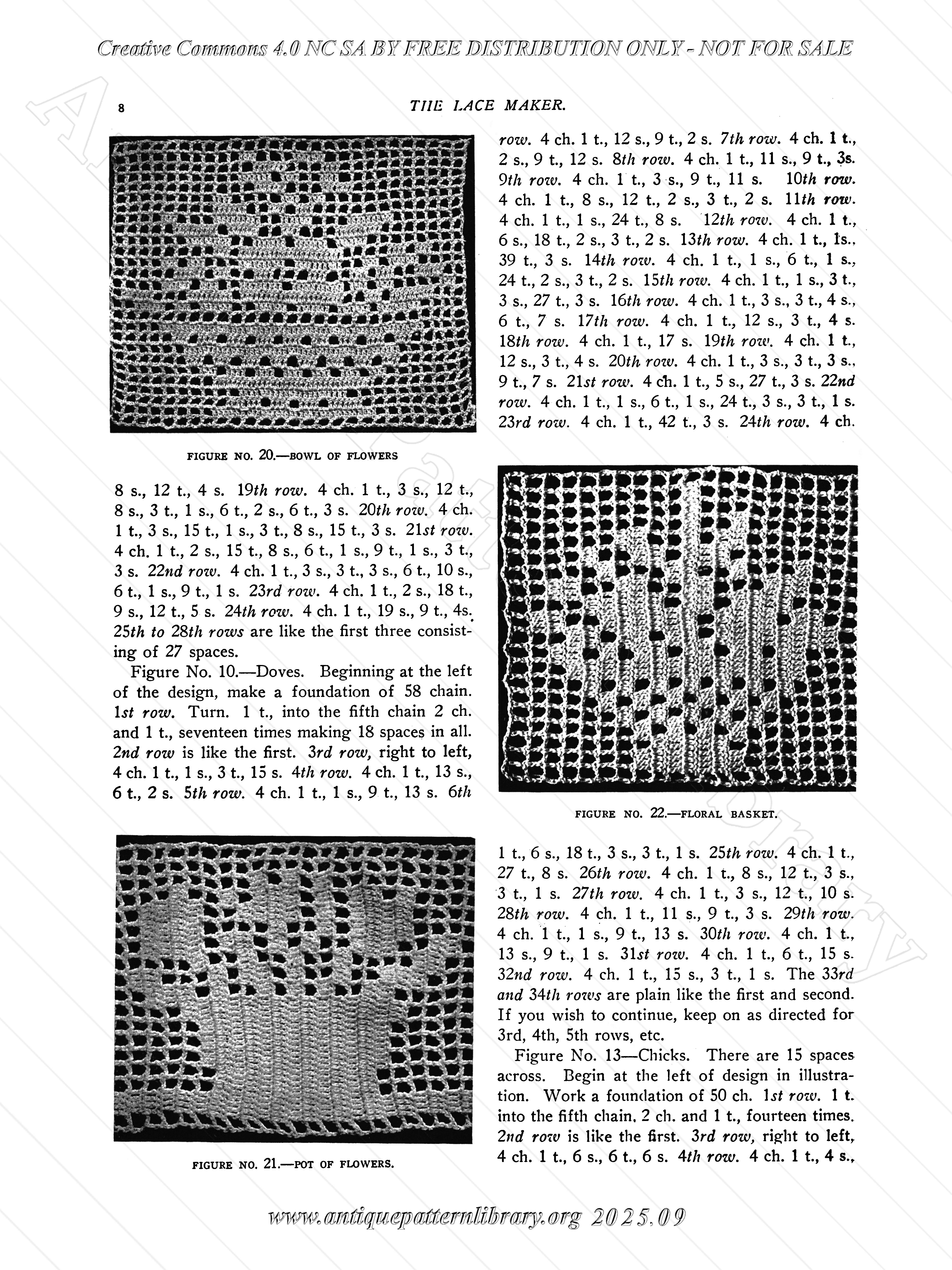 Introduction in Filet Crochet work, though not a basic how-to. Photographs of filet crochet work with the description of the patterns side by side. Mostly small motifs and narrow edgings, some corners and a few larger items. This publication dates from 1911, which is why not all patterns would be appropriate in modern publications.