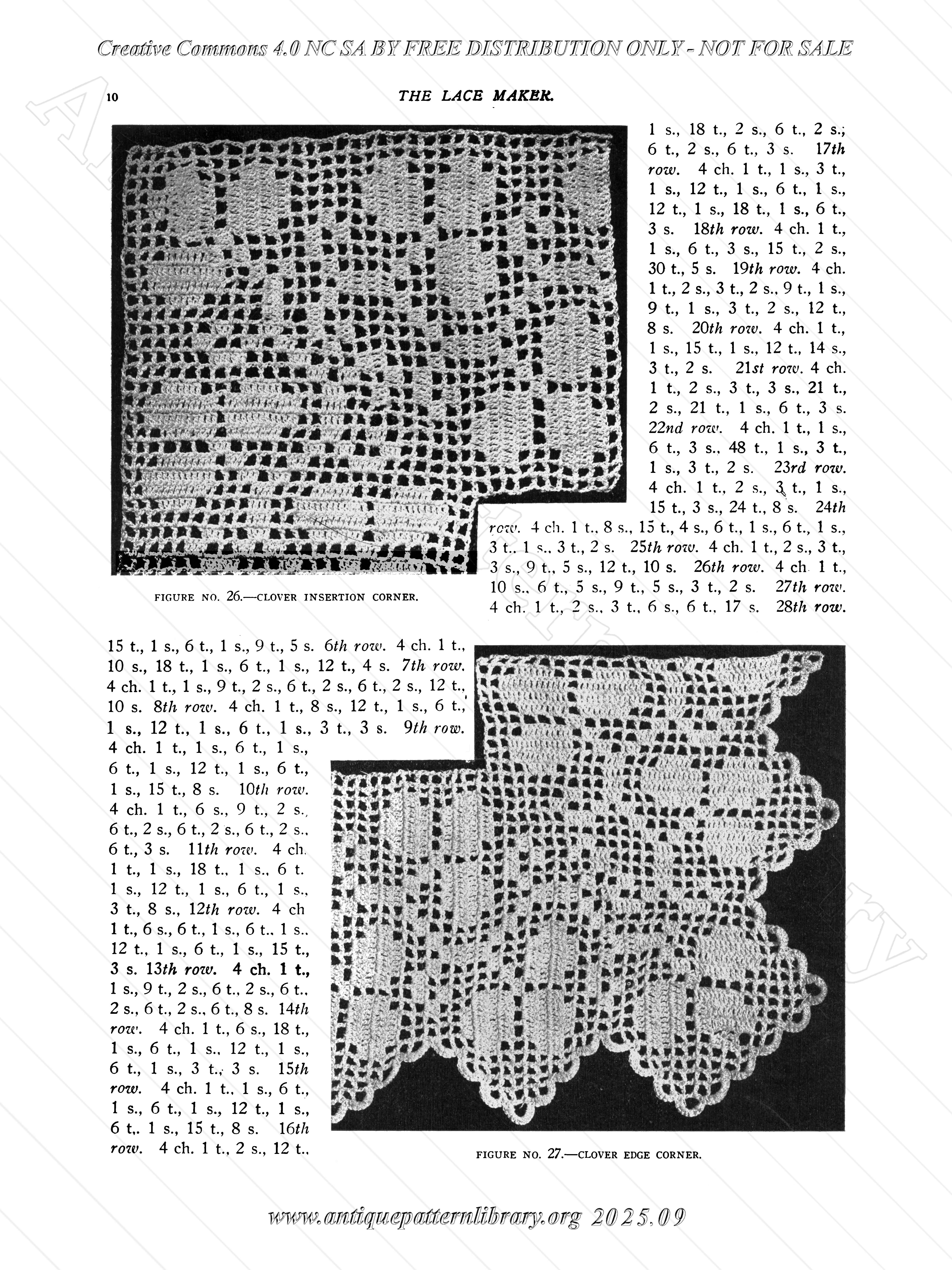 Introduction in Filet Crochet work, though not a basic how-to. Photographs of filet crochet work with the description of the patterns side by side. Mostly small motifs and narrow edgings, some corners and a few larger items. This publication dates from 1911, which is why not all patterns would be appropriate in modern publications.