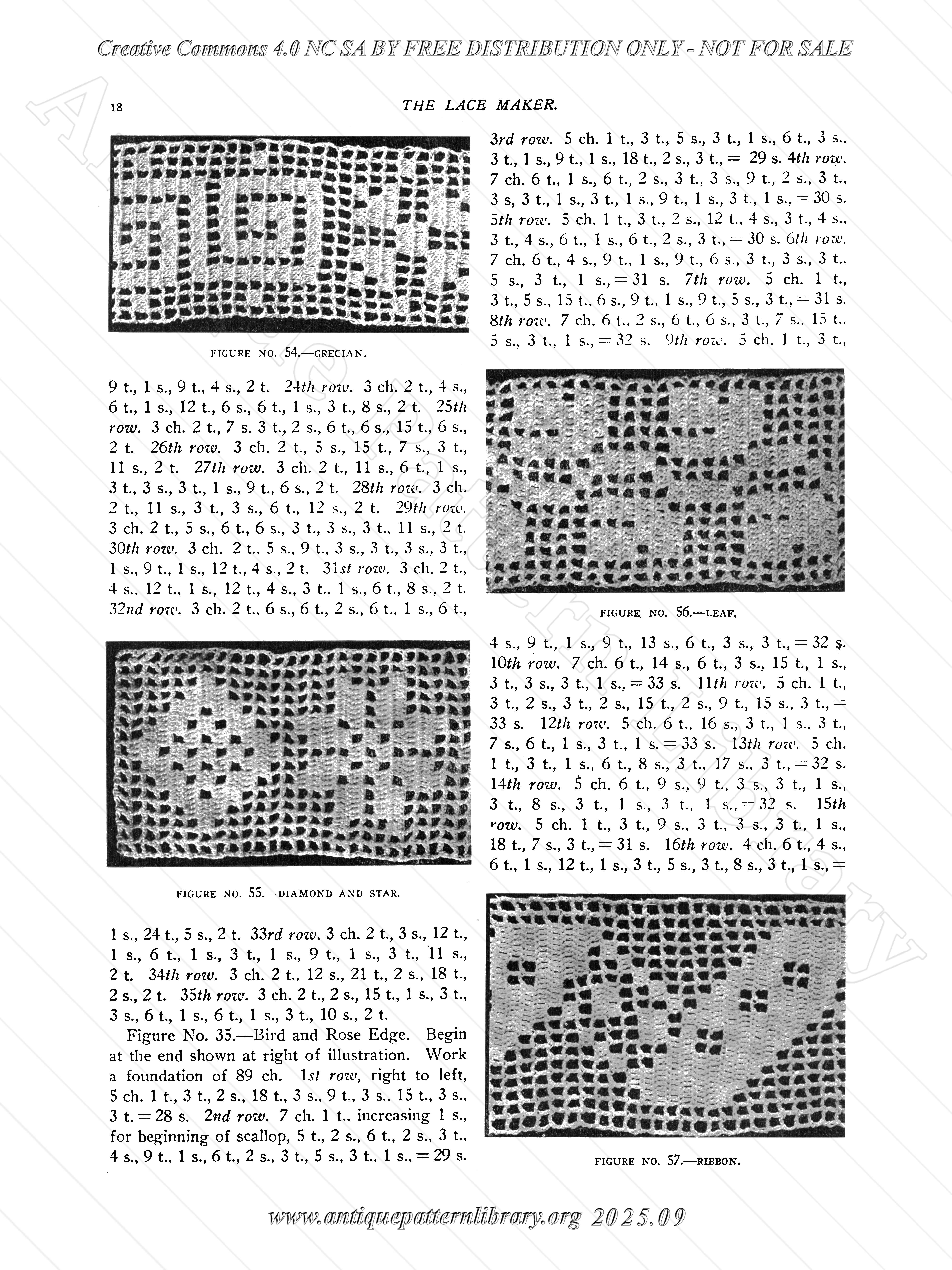 Introduction in Filet Crochet work, though not a basic how-to. Photographs of filet crochet work with the description of the patterns side by side. Mostly small motifs and narrow edgings, some corners and a few larger items. This publication dates from 1911, which is why not all patterns would be appropriate in modern publications.