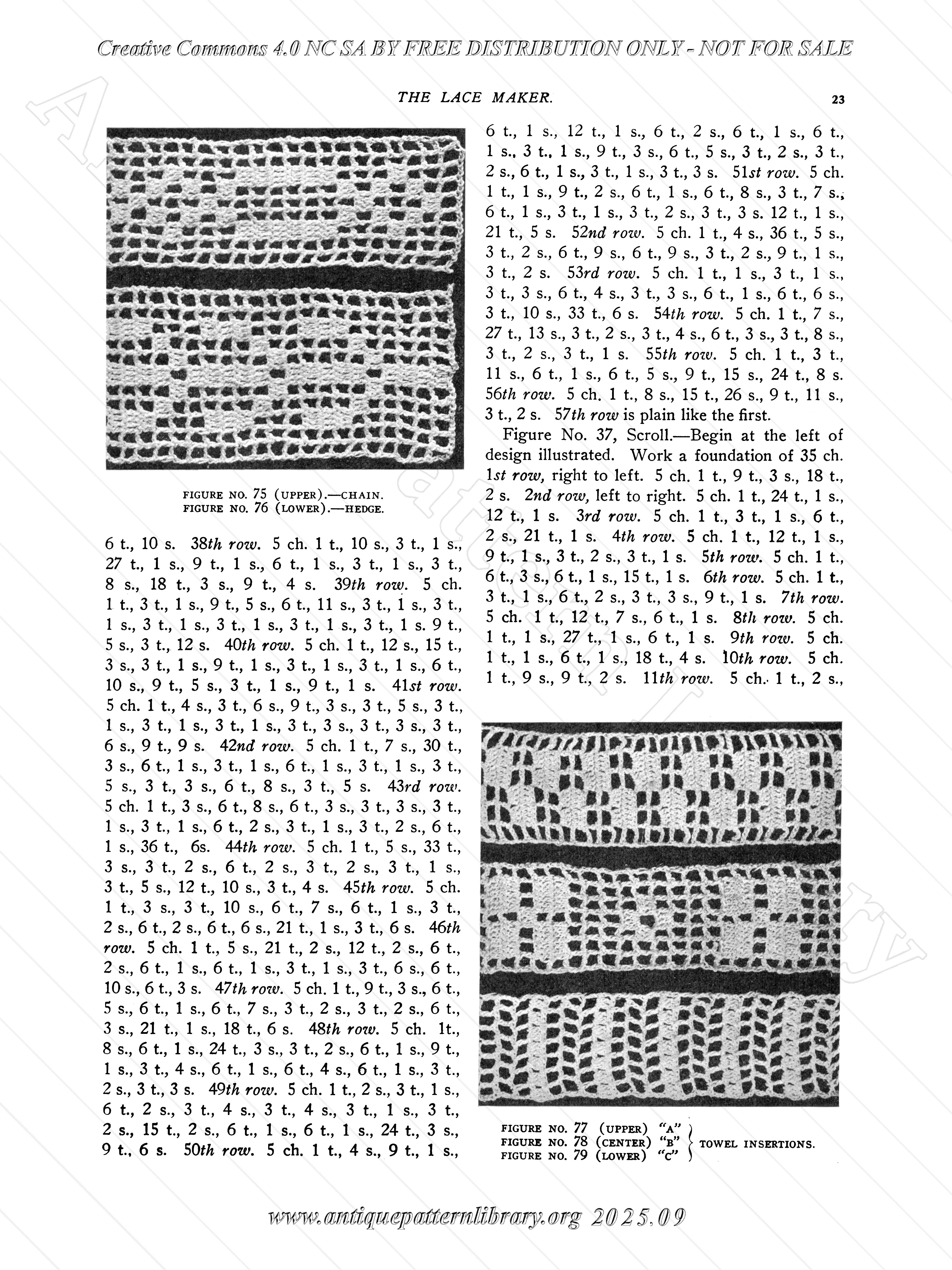 Introduction in Filet Crochet work, though not a basic how-to. Photographs of filet crochet work with the description of the patterns side by side. Mostly small motifs and narrow edgings, some corners and a few larger items. This publication dates from 1911, which is why not all patterns would be appropriate in modern publications.