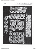 For next row make 5 long t c with 2 ch between in one knot, fasten by sl st in next knot. For edge make 5 ch with sl st in each 2 ch. For upper edge ch 4 sts and fasten by sl st in 3 loops of lace
