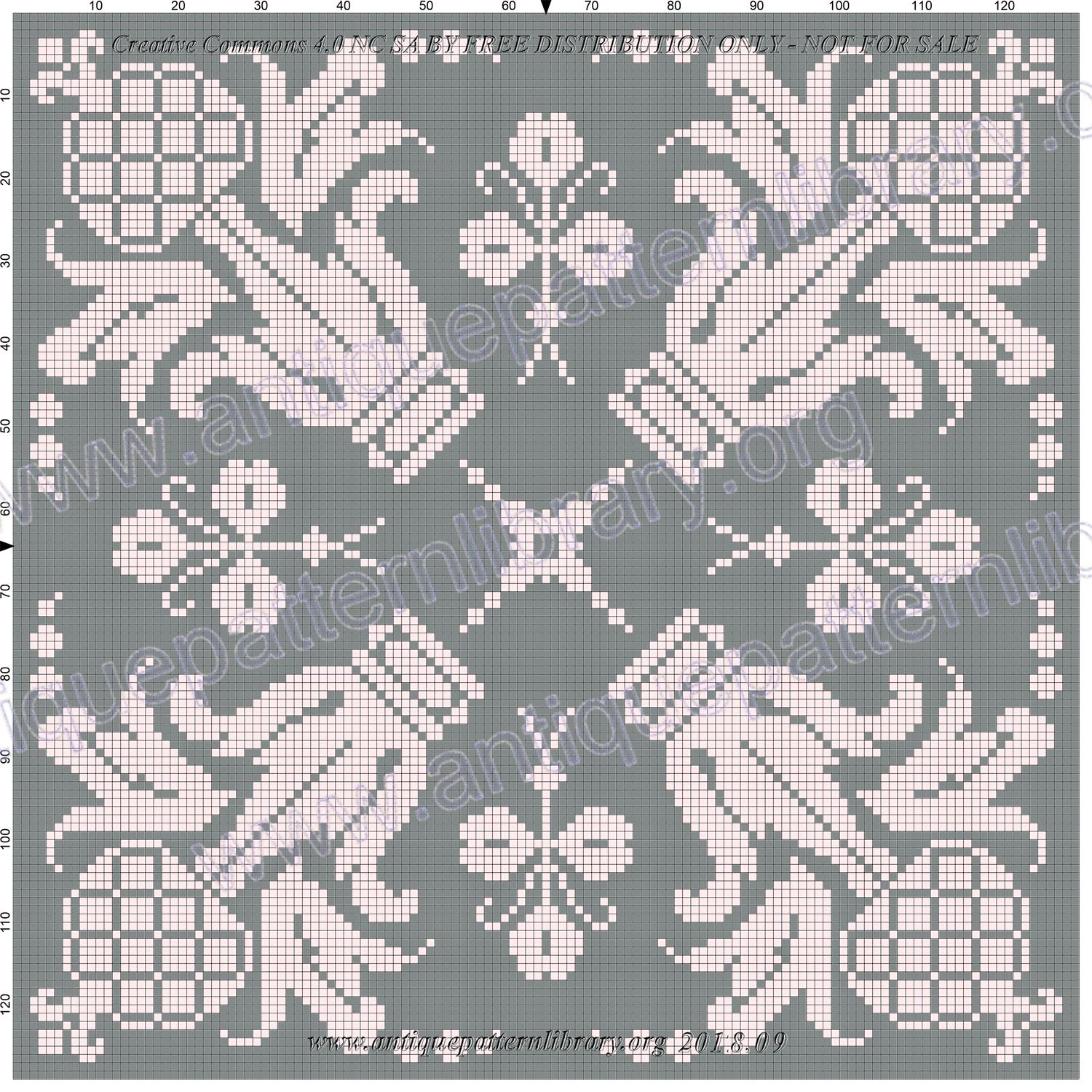 Charted design for a square motif featuring pineapples, intended for filet (darned net) and to be inserted in a tablecloth. Can also be used for filet crochet or cross stitch.