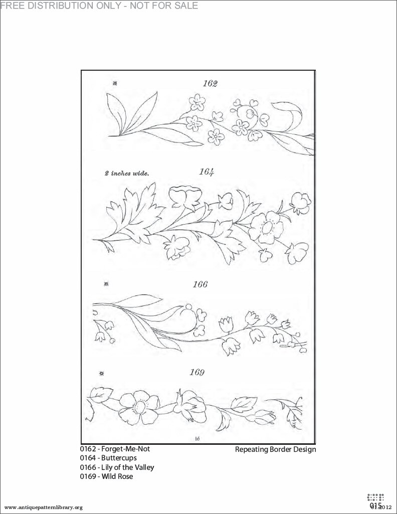 A large collection of freehand embroidery designs, circa 1884-1900. Original book was of early hot iron transfers - the reproduction has changed the size, bu they can be restored to original dimensions with an enlarging<br>educing photocopier or computer drawing program. Includes floral borders and insertionss, wreaths, scallops and edgings for clothing, handkerchiefs, and linens; designs for applied braid or soutache (some can be used for Battenberg lace). Some designs have intended use or color notation; floral sprays and botanical/fruit sprigs; drawings of Japanese porcelain dishes and fans; designs for mens' smoking caps; small insects and butterflies; birds; floral corners; brackets (designs for shelf linens or valences); apron/pinafore decroration; slipper tops; lingerie bags; pillow shams; monograms and initials; drawings of dresses indicating recommended placement of embroidery; devotional/church designs; adorable children at play; Kate Greenway village vignettes. LImited number of Russian cross-stitch designs; dogs and cats; sporting motifs.