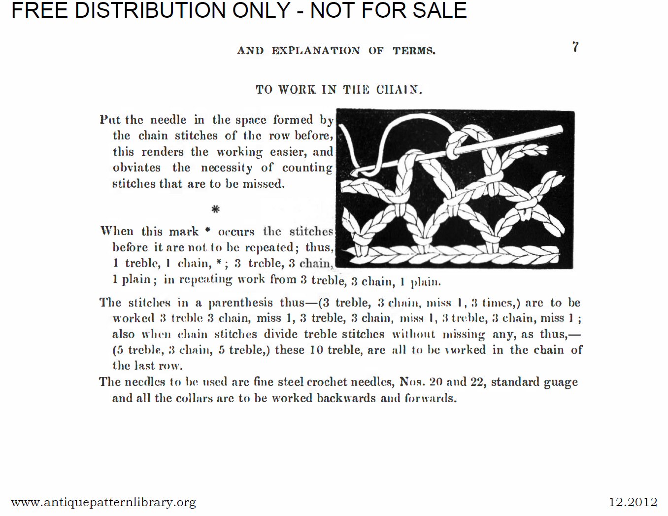 Instructions and crochet terms, vy useful for reading her later books, patterns for collars, cuffs and a wide variety of laces intended to imitate French laces