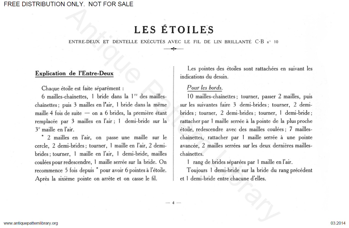 French language prose instructions for nine sets of crocheted insertion strips and their matching heavily fringed edgings. Includes photographs of finished strips and edgings. Deeply textured, heavy, yet lacy, these intended to be worked in cotton, and used for curtains, valences, portieres, shelf and mantlepiece trims.