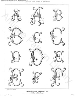 All of the embroidery project plates from the1893 volumes of the periodical Magasin des Demoiselles. Freehand designs for surface embroidery, cutwork, whitework monograms, devotional designs, all-over and border designs for lingerie and shirtwaists (blouses), cuffs and collars, Broderie Anglaise (whitework eyelet embroidery), metal thread embroidery, tea napkins and table linens, and more. No counted designs.