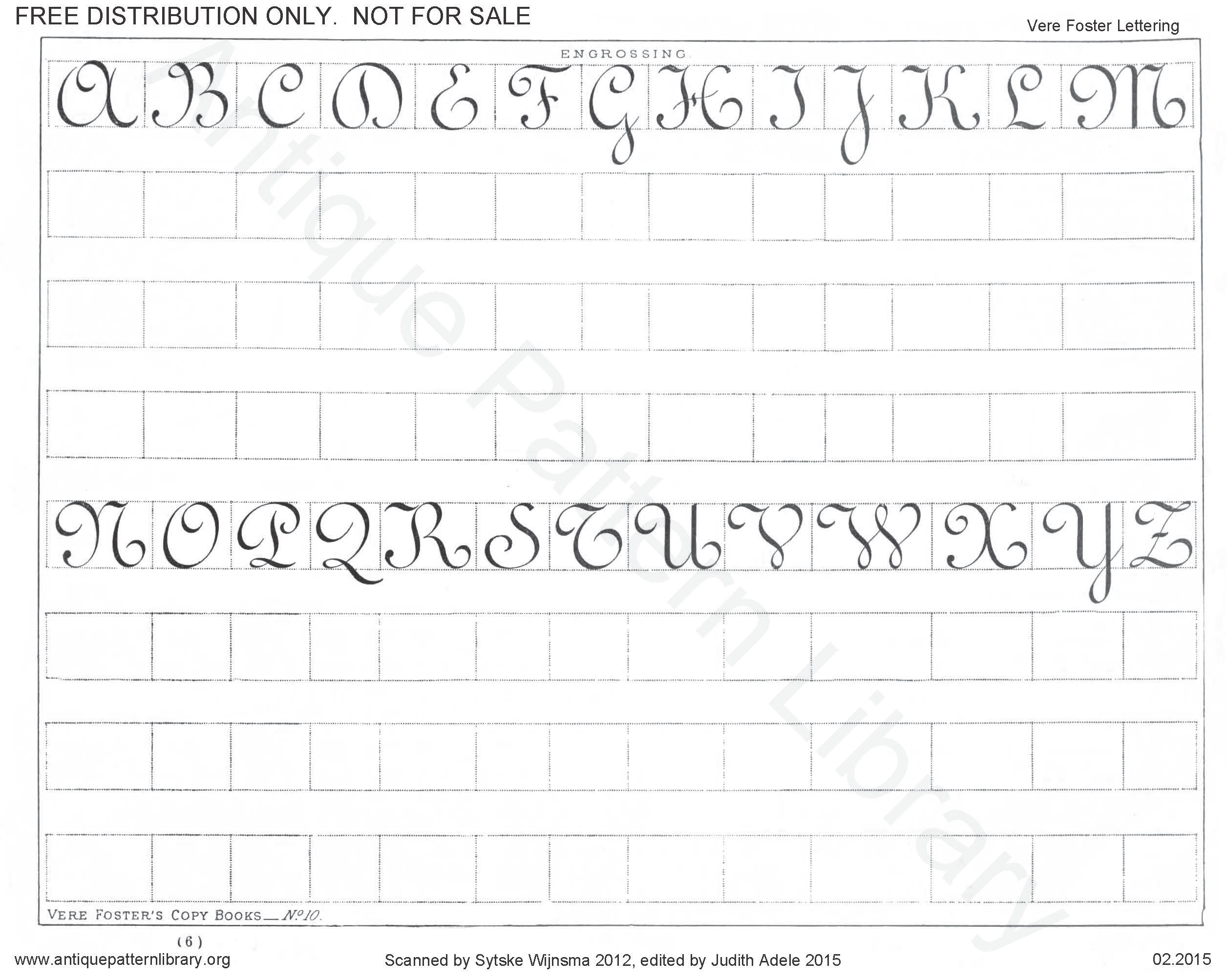 Exercise/copy book for introductory and intermediate calligraphy. Pages offer alphabets and workspace area with pen stroke training marks. Standard italic serif, sans serif, script, blackletter, and fancy initials, intended for use on placards, labels, awards - not necessarily daily penmanship.