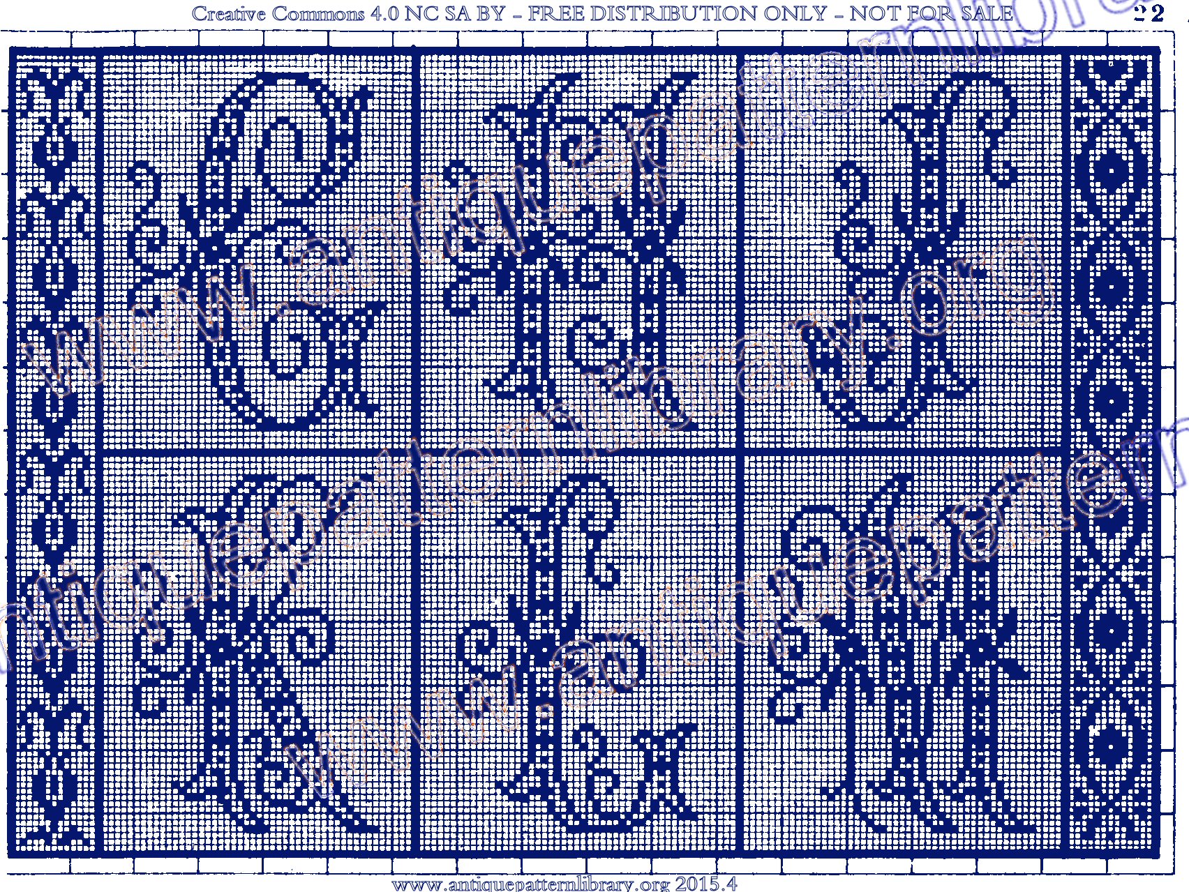 Charted monochrome alphabets, and freehand drawn alphabets for monogram use. Assorted sizes, from small to large in many styles. Some small ornaments (crowns, barnyard animals, steamship), also some numbers. Charts suitable for cross-stitch and other graph-dependent styles. Freeform suitable for whitework or other surface embroidery.