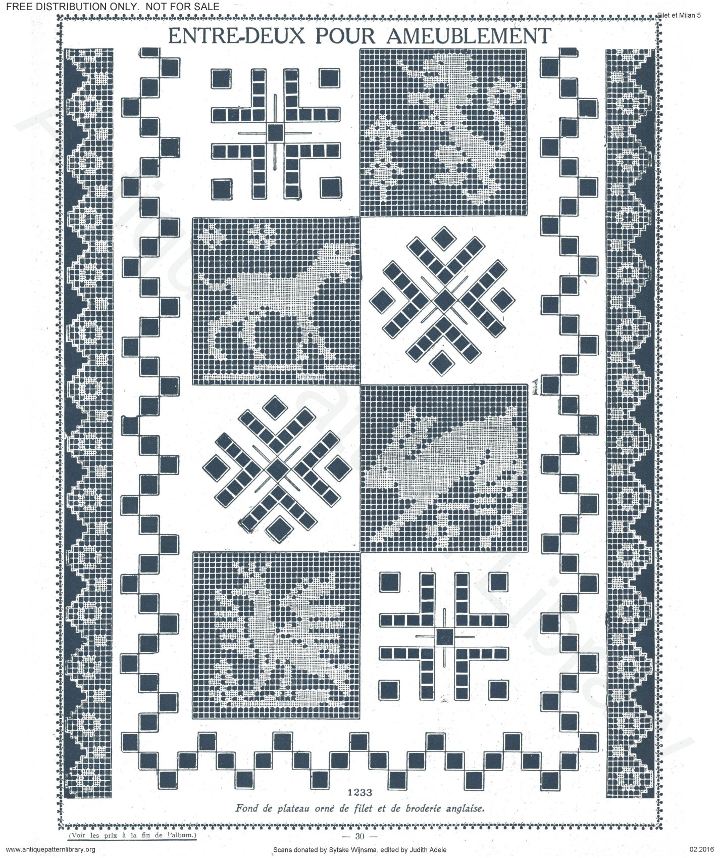 Large collection of charted designs intended for filet (net darning) or filet crochet. Some can be adapted to cross stitch. Designs include devotional items, floral otifs, classical scenes, geometrics, chinoiserie. Also designs for tape lace (Battenberg). Many designs include thumbnails of intended decorative use.