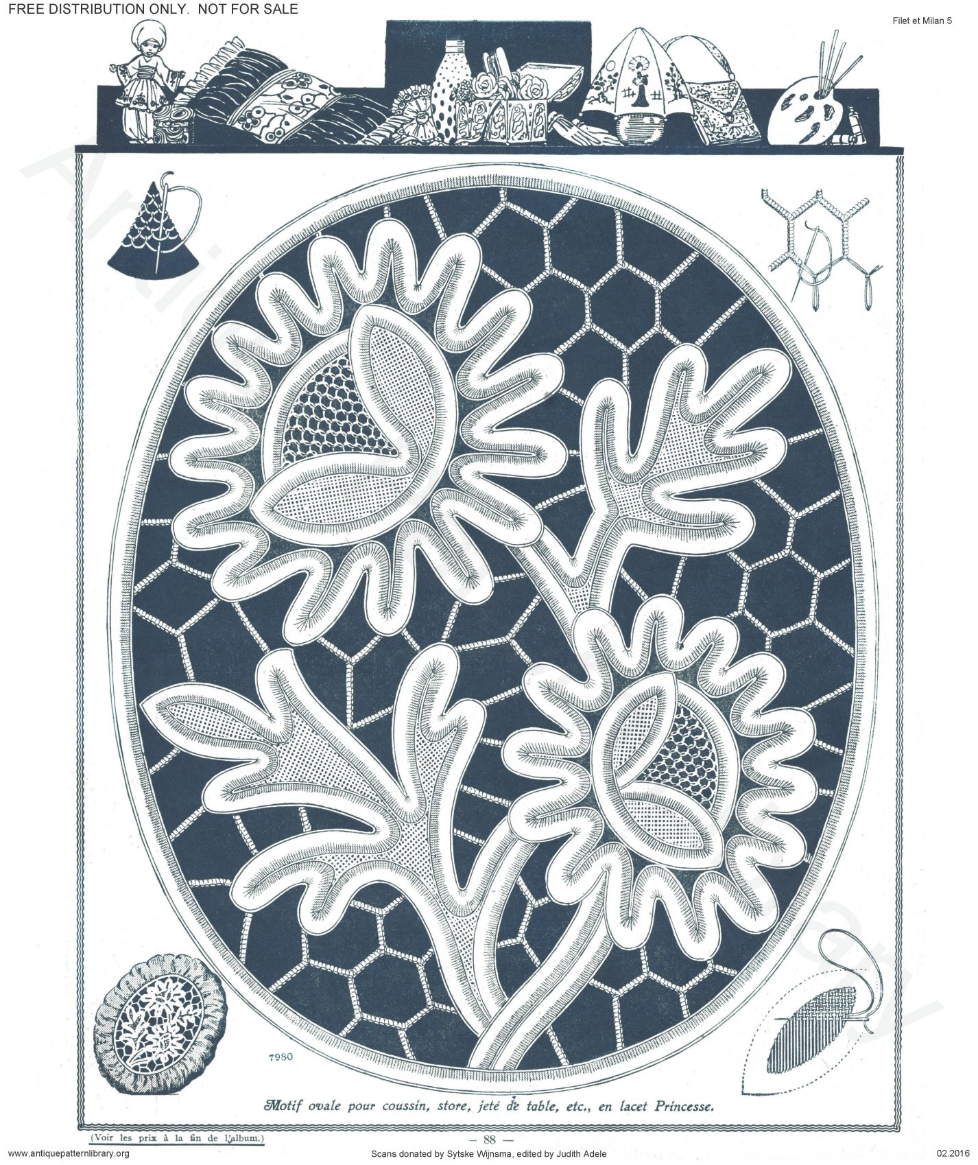 Large collection of charted designs intended for filet (net darning) or filet crochet. Some can be adapted to cross stitch. Designs include devotional items, floral otifs, classical scenes, geometrics, chinoiserie. Also designs for tape lace (Battenberg). Many designs include thumbnails of intended decorative use.