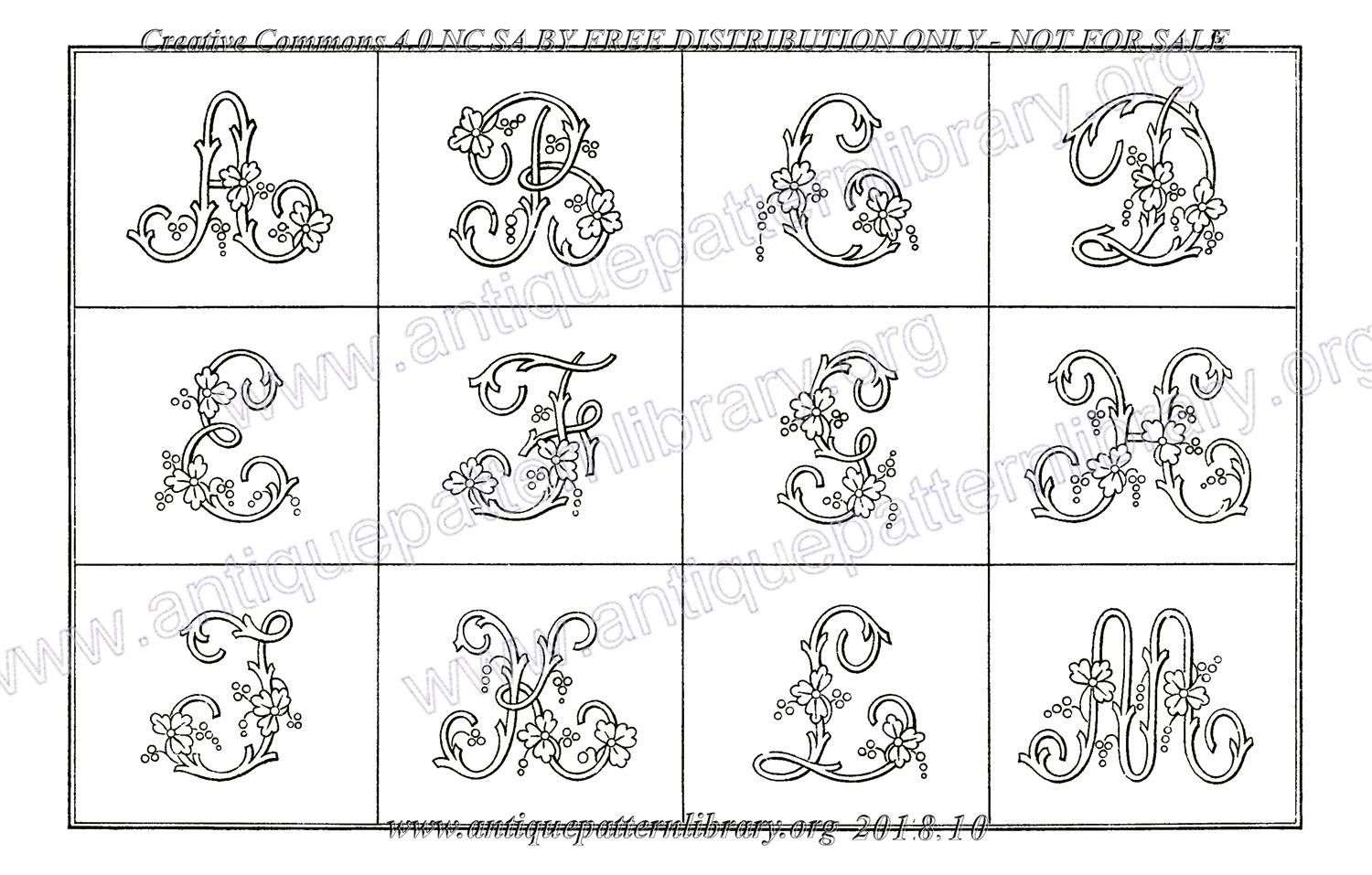 Eleven line drawn alphabets on 16 pages, some gothic, some lovely florals. Intended for whitework and surface embroidery.