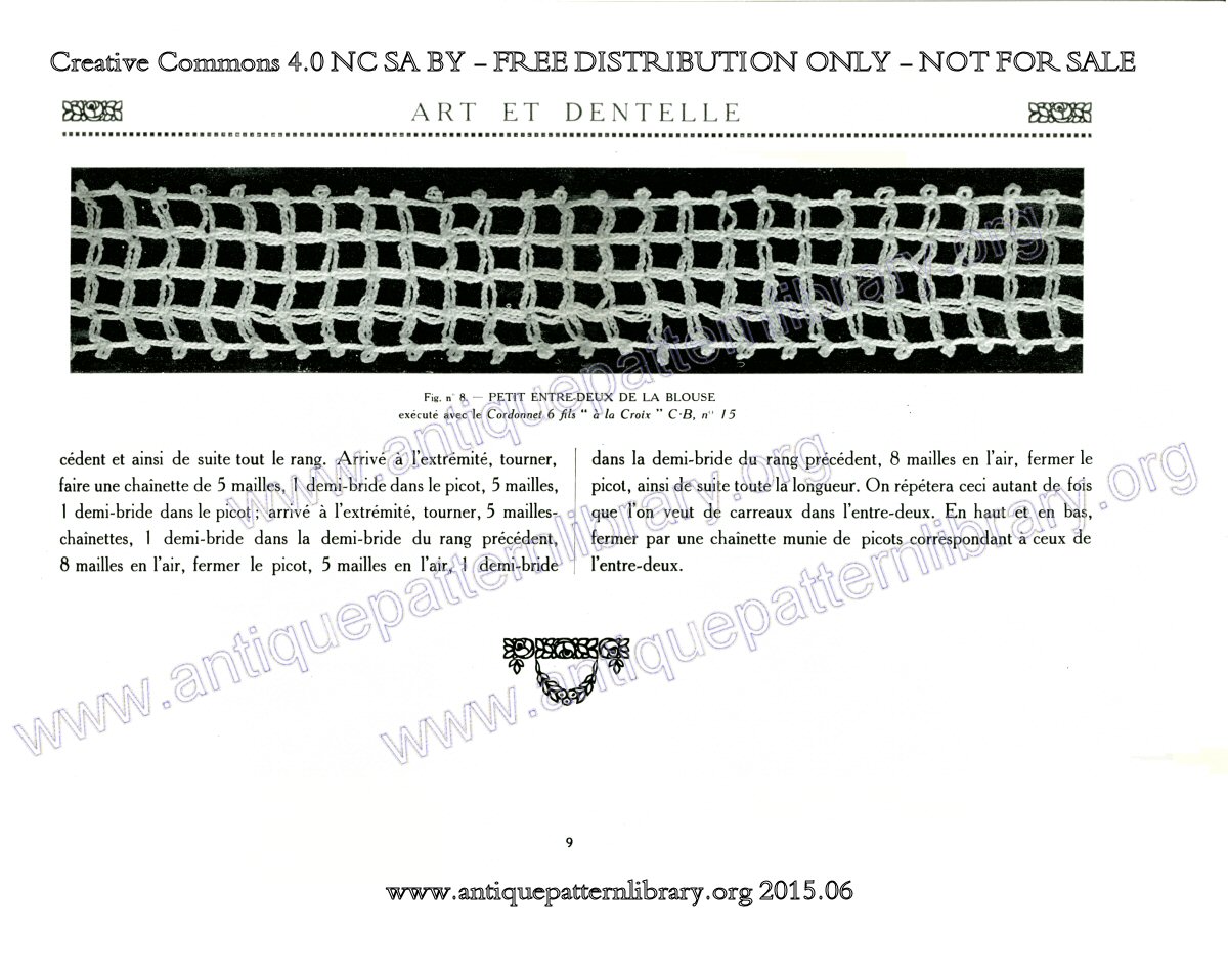 Unusual motifs and panels in deeply embossed crochet, similar to Irish Crochet. French language instructions, some charts for a project with filet crochet trim. Collection includes a purse with an acrobat, a carnation cuff and collar set, with matching insertions for a blouse; and a sampler of crochet mimicing other lace styles.