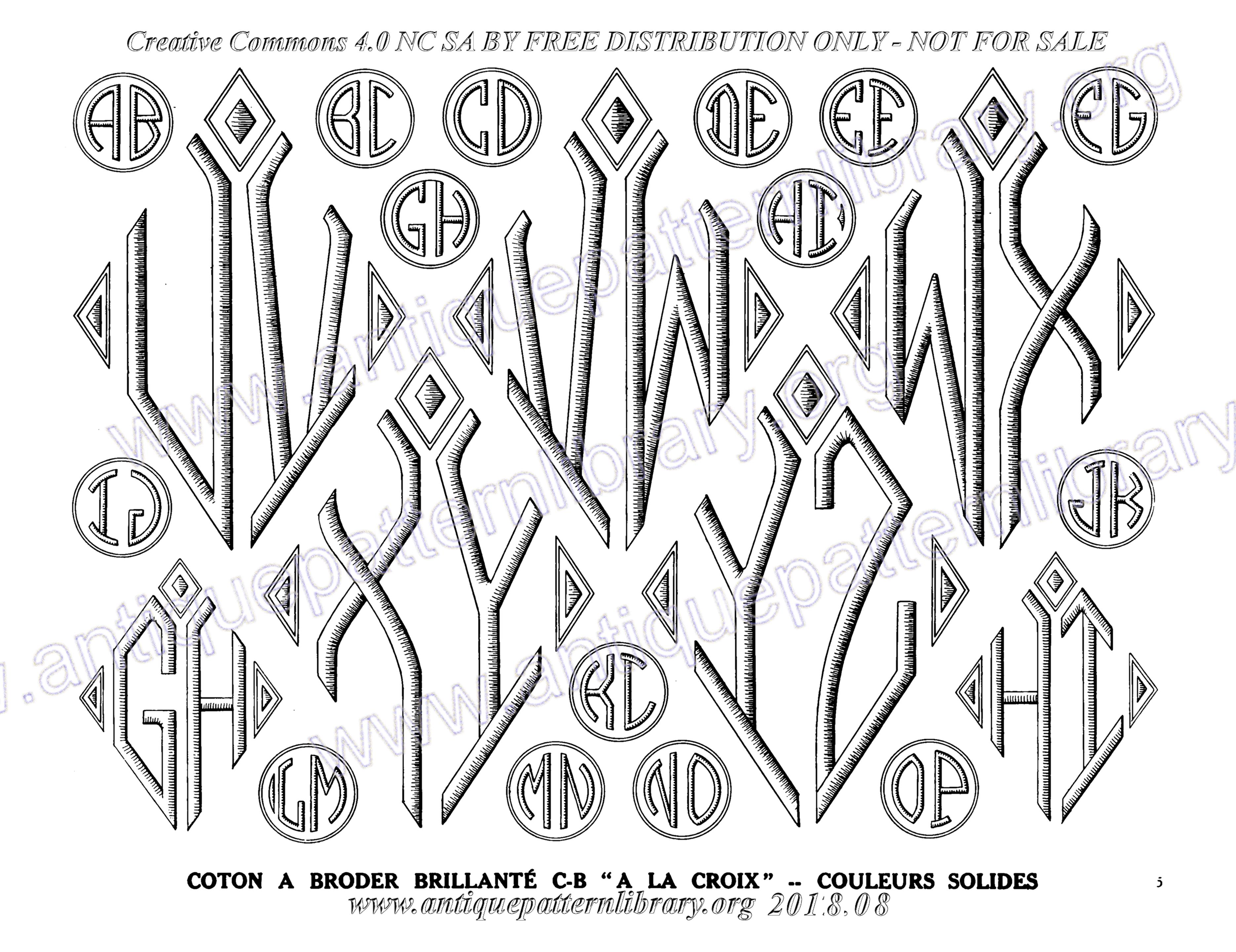 32 page collection of designs for hand embroidered monograms and initials. Largely diamond lozenge shape monograms, appopriate for whitework; plus two freehand drawn script alphabets; and two charted floral-ornamented alphabets intended for cross-stitch. Supplemental designs in and around the main alphabets include smaller single initial monograms in several styles.