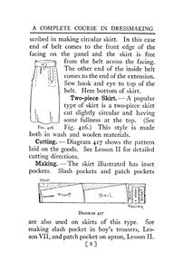 From the earlier, much shorter Complete Course of Dressmaking. Circular skirt, gored skirt, skirt with yoke. Drawings show the layout of pattern pieces and some details of sewing.