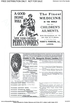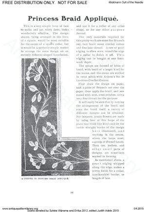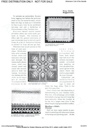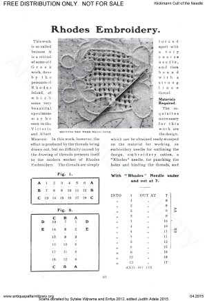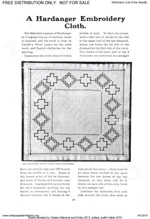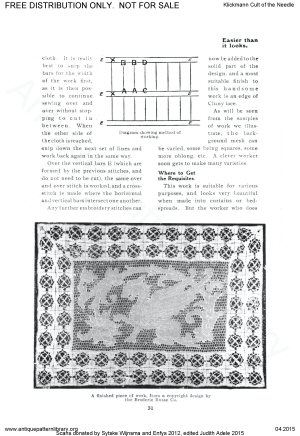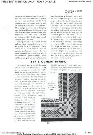 Needlework book including articles and projects on Hungarian white cutwork, knotting fringes, basic netting and filet net darning; Berlin woolwork (needlepoint), Reticella, Catalan embroidery (cutwork with needle lace fillings or grounds), Rhodes emroidery (drawnwork with surface stitching accents), New Baro embroidery (more cutwork with simplified buttonhole ground), Innishmacsaint Lace (needle lace), Amager embroidery ("art needlework" surface embroidery), Hardanger, Brussels Braid (applied braid on machine made net with needle lace fillings), Carimackross lace, Bulgarian embroidery (pattern darning), Limerick tambour (tambour on machine net), hemstitching, bead stringing, Huckaback darning (Swedish darning), Hedebo, and dressmakers' details. Also workbox tools, dolls as teaching aids, and mending.