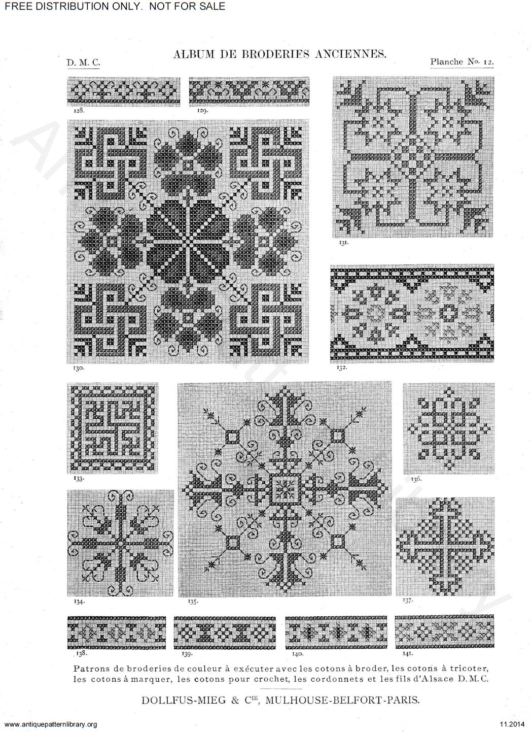 French language collection of counted thread designs for traditional folk and historical embroidery, presented as engravings detailed enough to use as charts. Some have notes on multicolor execution. Includes all-over designs, strips for insertions and borders (some with corners), some incorporating straight stitches (double running or back stitch). Also sampler style alphabets, and a few stand-alone motifs. Instructions describe stitches including two-sided cross-stitch, but do not include source notes for the patterns.