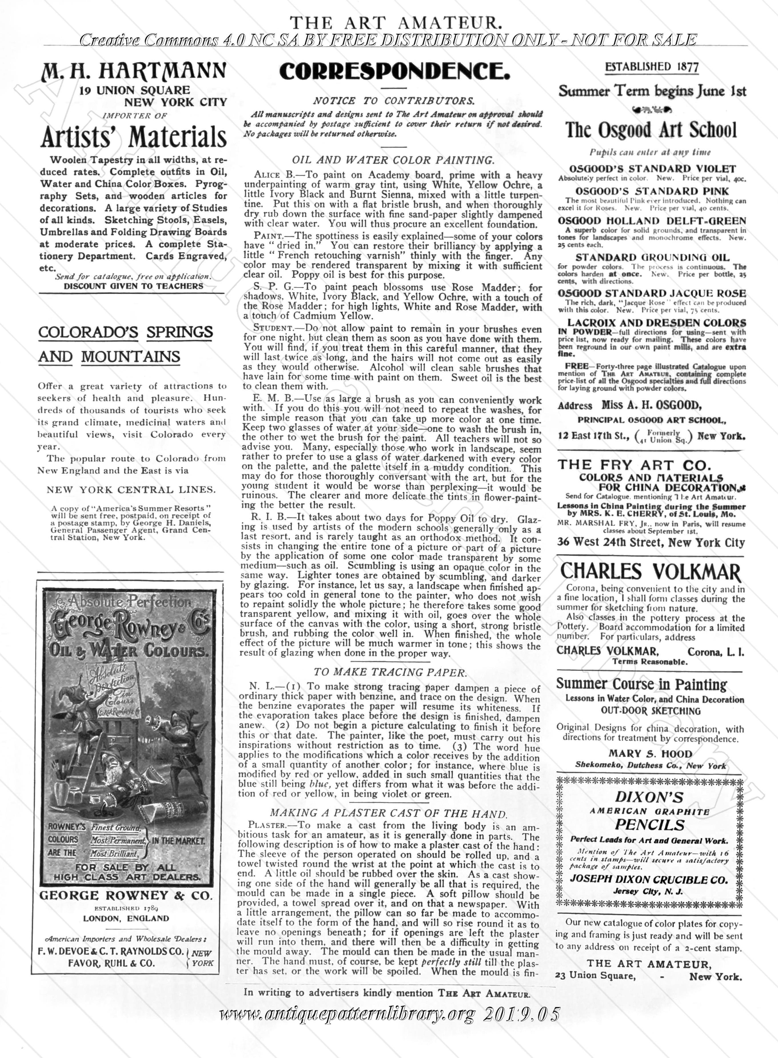 Large foldout templates for wood carving, embroidery. Articles on art collecting, pen, crayon and charcoal drawing, painting on glass, metal working, ceramic painting, plaster casting, metal etching.