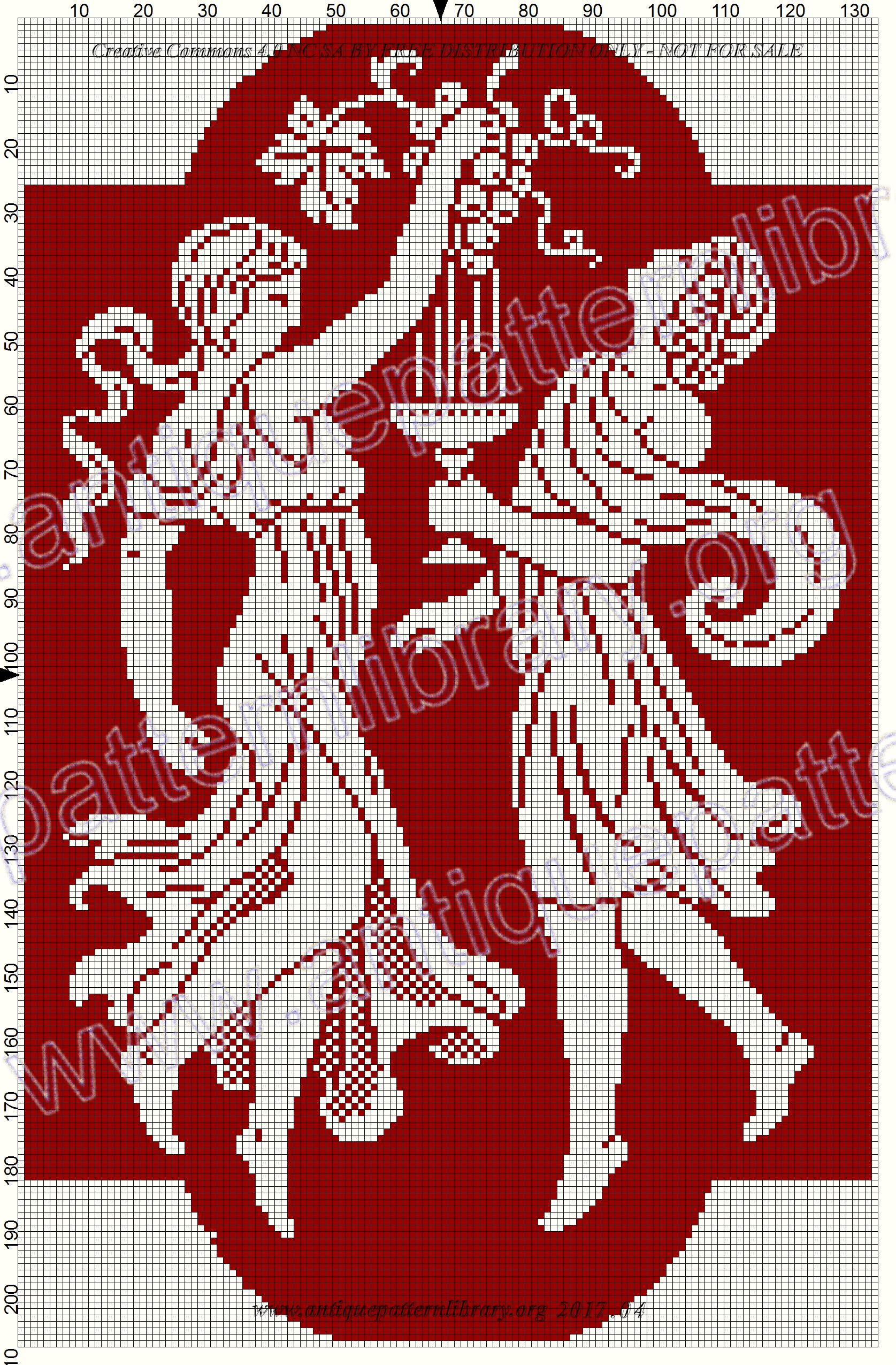 Volume 3 from the well-known Filet Ancien series. Charted designs for darned net (filet), also useful for filet crochet, cross-stitch, and voided embroidery (Assisi). Motifs include classical Greek/Roman gods, heroes, and cherubs; Egyptian heiroglyphics and ornament; geometric and floral borders, strips, corners, and ovals; Renaissance formal beasts and birds; cornucopias, urns and baskets; months of the year; kings and knights; a panel of celtic entwined beasts; the four seasons; a majestic dragon; and what looks to be a coat or jacket. Modern re-charting provided for ease of use.