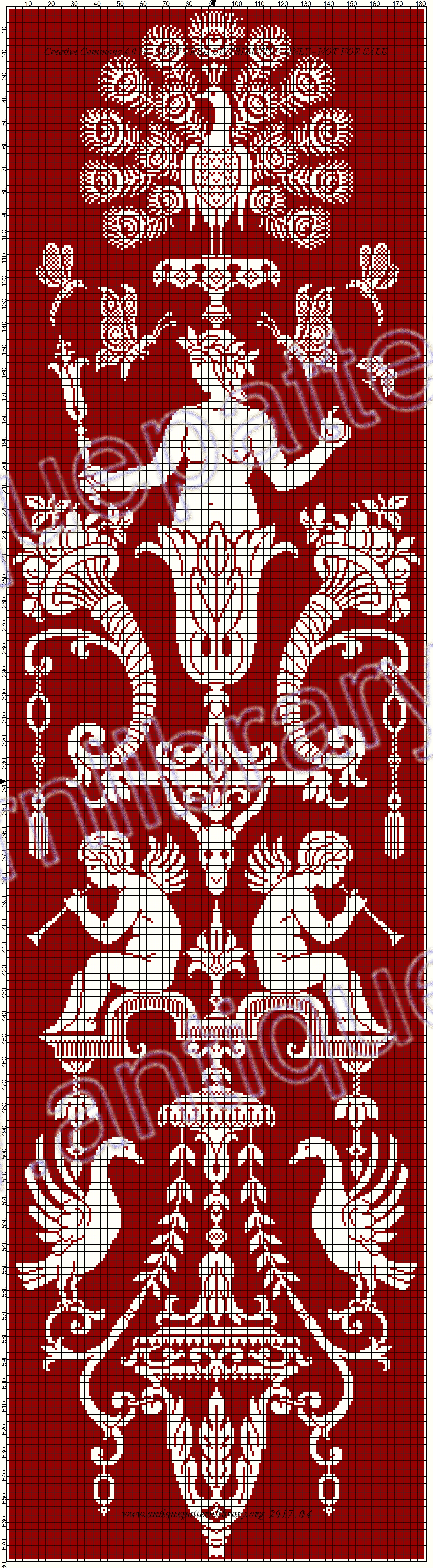 Volume 3 from the well-known Filet Ancien series. Charted designs for darned net (filet), also useful for filet crochet, cross-stitch, and voided embroidery (Assisi). Motifs include classical Greek/Roman gods, heroes, and cherubs; Egyptian heiroglyphics and ornament; geometric and floral borders, strips, corners, and ovals; Renaissance formal beasts and birds; cornucopias, urns and baskets; months of the year; kings and knights; a panel of celtic entwined beasts; the four seasons; a majestic dragon; and what looks to be a coat or jacket. Modern re-charting provided for ease of use.
