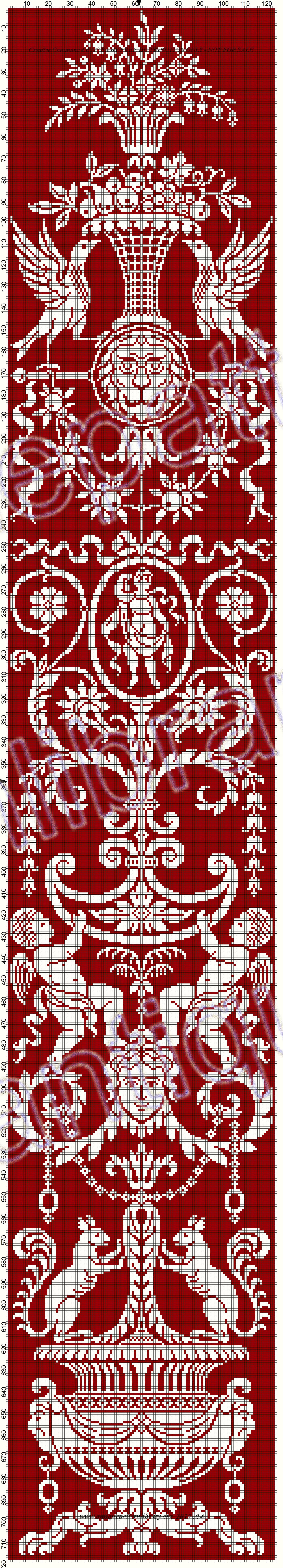 Volume 3 from the well-known Filet Ancien series. Charted designs for darned net (filet), also useful for filet crochet, cross-stitch, and voided embroidery (Assisi). Motifs include classical Greek/Roman gods, heroes, and cherubs; Egyptian heiroglyphics and ornament; geometric and floral borders, strips, corners, and ovals; Renaissance formal beasts and birds; cornucopias, urns and baskets; months of the year; kings and knights; a panel of celtic entwined beasts; the four seasons; a majestic dragon; and what looks to be a coat or jacket. Modern re-charting provided for ease of use.