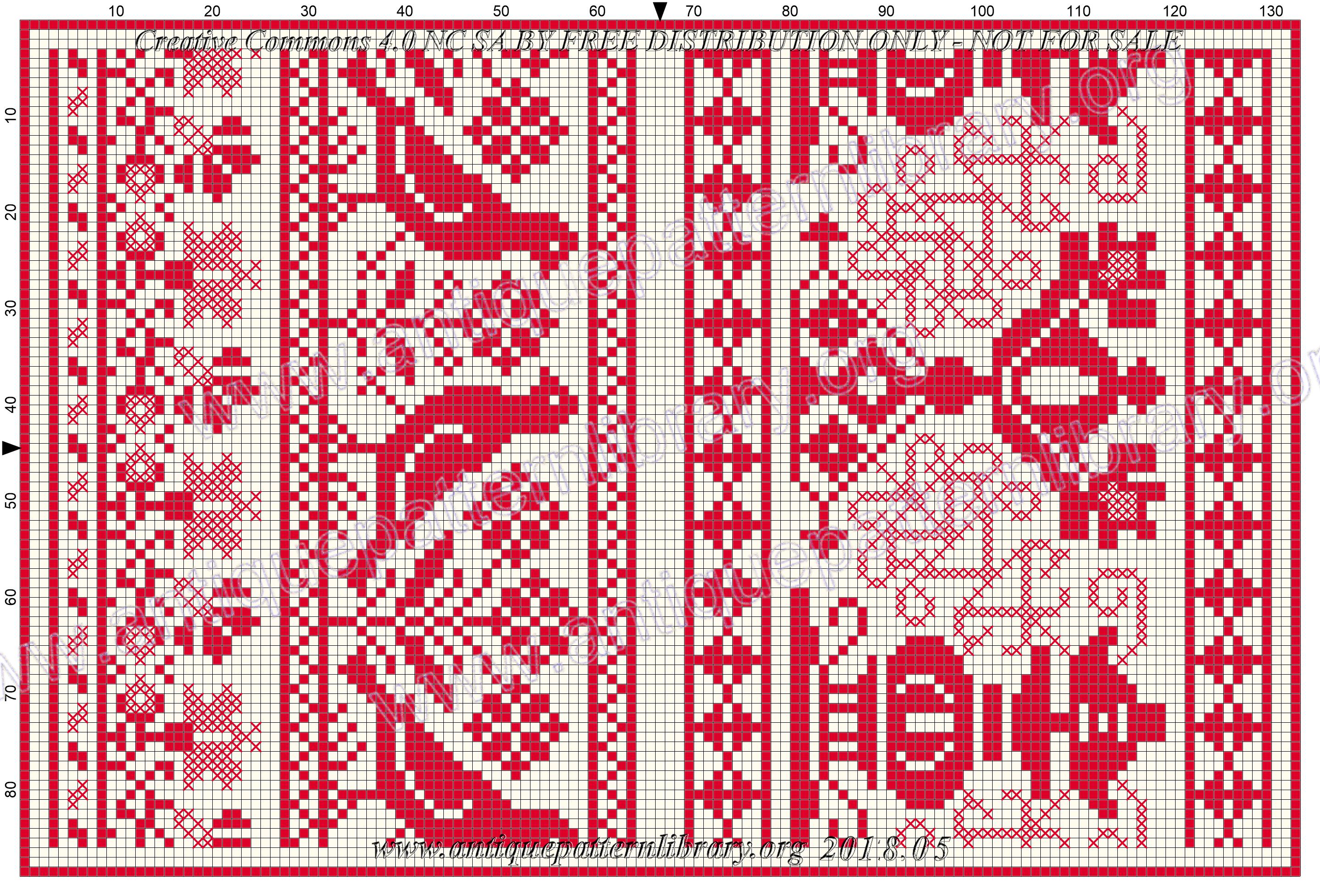 8 pages of charted designs suitable for cross-stitch. Two colors are implied by use of shading. Traditional all-over designs, folk borders and corners; some designs (facing birds, interlace borders) appear in older design collections. Title in German, French and Russian. No date, probably around 1900.