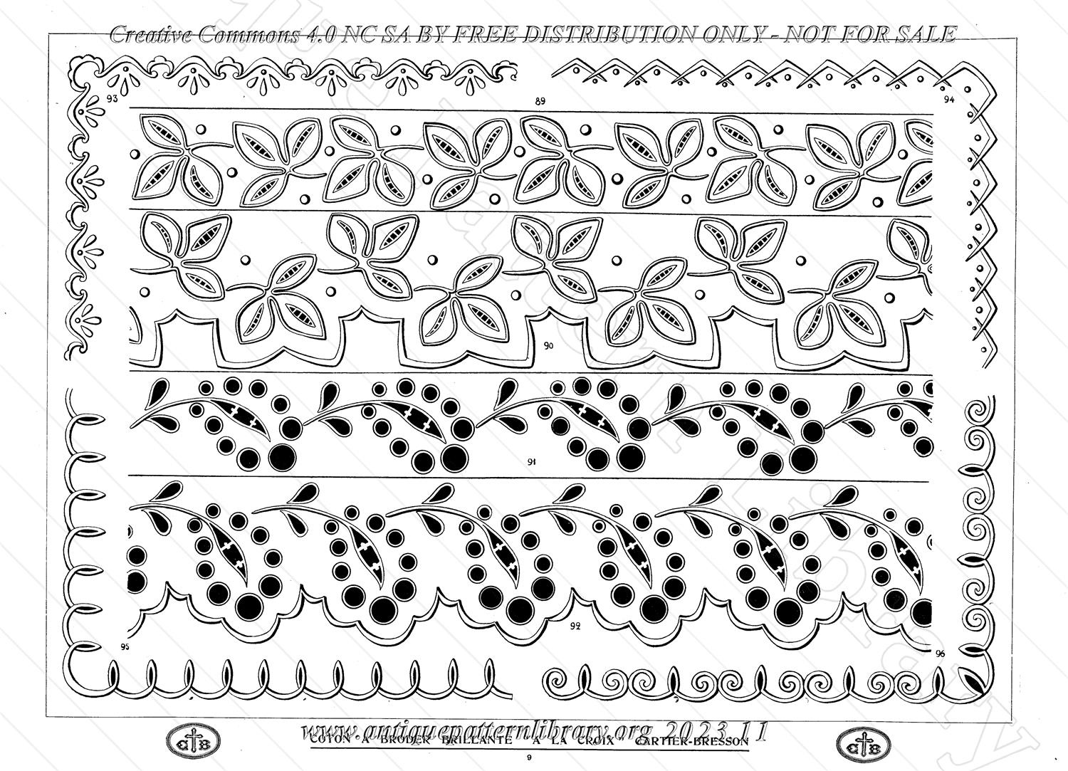 Album from the same series as Filet Ancien, mainly freehand designs intended for whitework, cutwork and surface embroidery borders, plus two pages of cross stitch borders. Some Broderie Anglaise eyelet work. Two pages of designs for applique on machine-made net. Models are mostly scrolling, scalloped motifs, flowers and foliage.