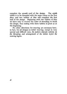 Second book in the series of weaving with small appliances. An explanation of tablet weaving for beginners; how to set up a tablet warp, loom for tablet weaving, designing patterns, and a number of illustrated examples.