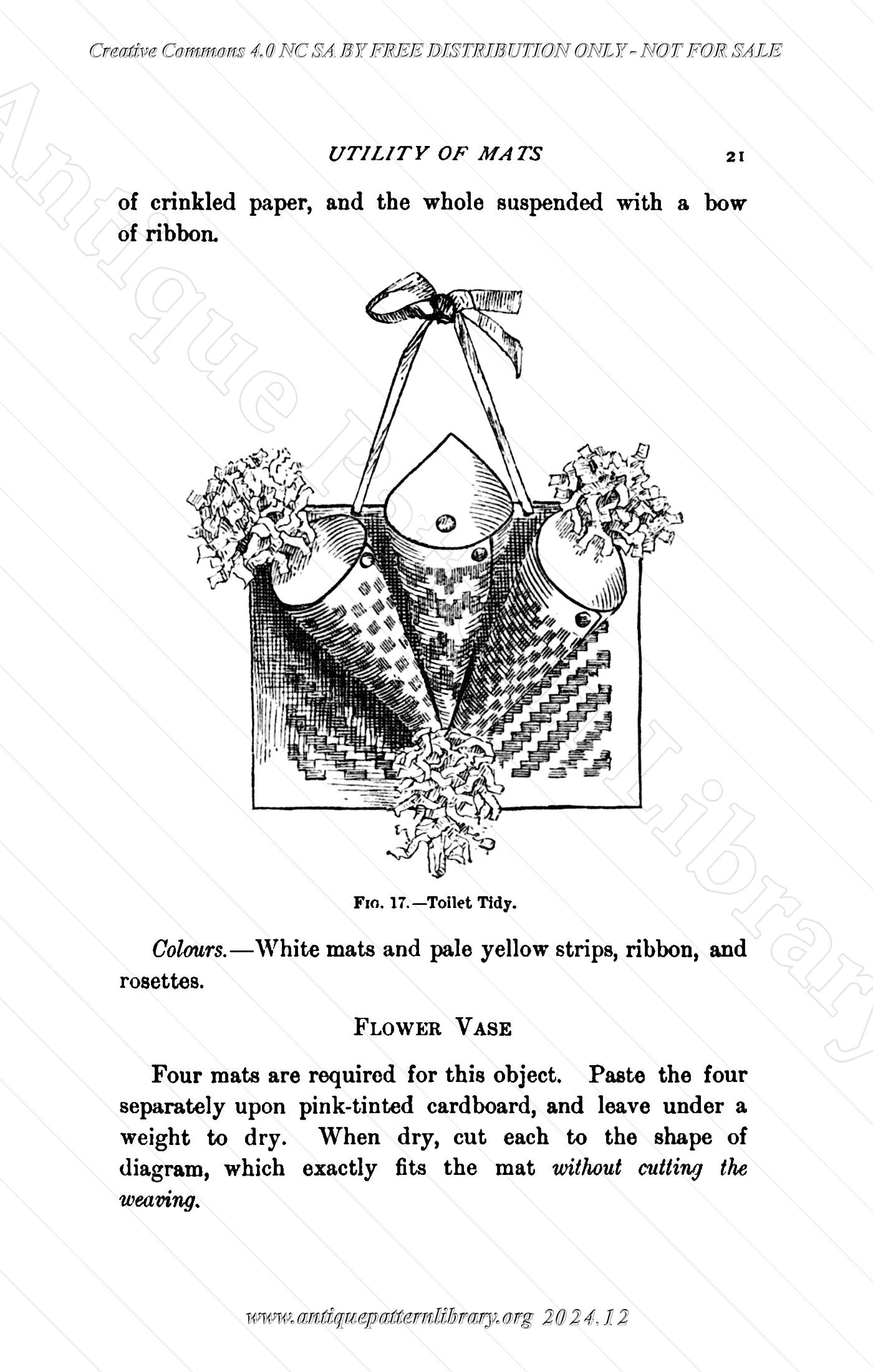 Small hardcover bound book, containing instructions on how to teach little children paper plaiting, weaving, chair caning and straw work. Many illustrations. Some sections talk of "children" in general, others are focused on "girls" or "boys". Added instructions on how to make useful and decorative objects from the completed work pieces. Quite useful to help occupying children from kindergarten age at home or in the classroom.