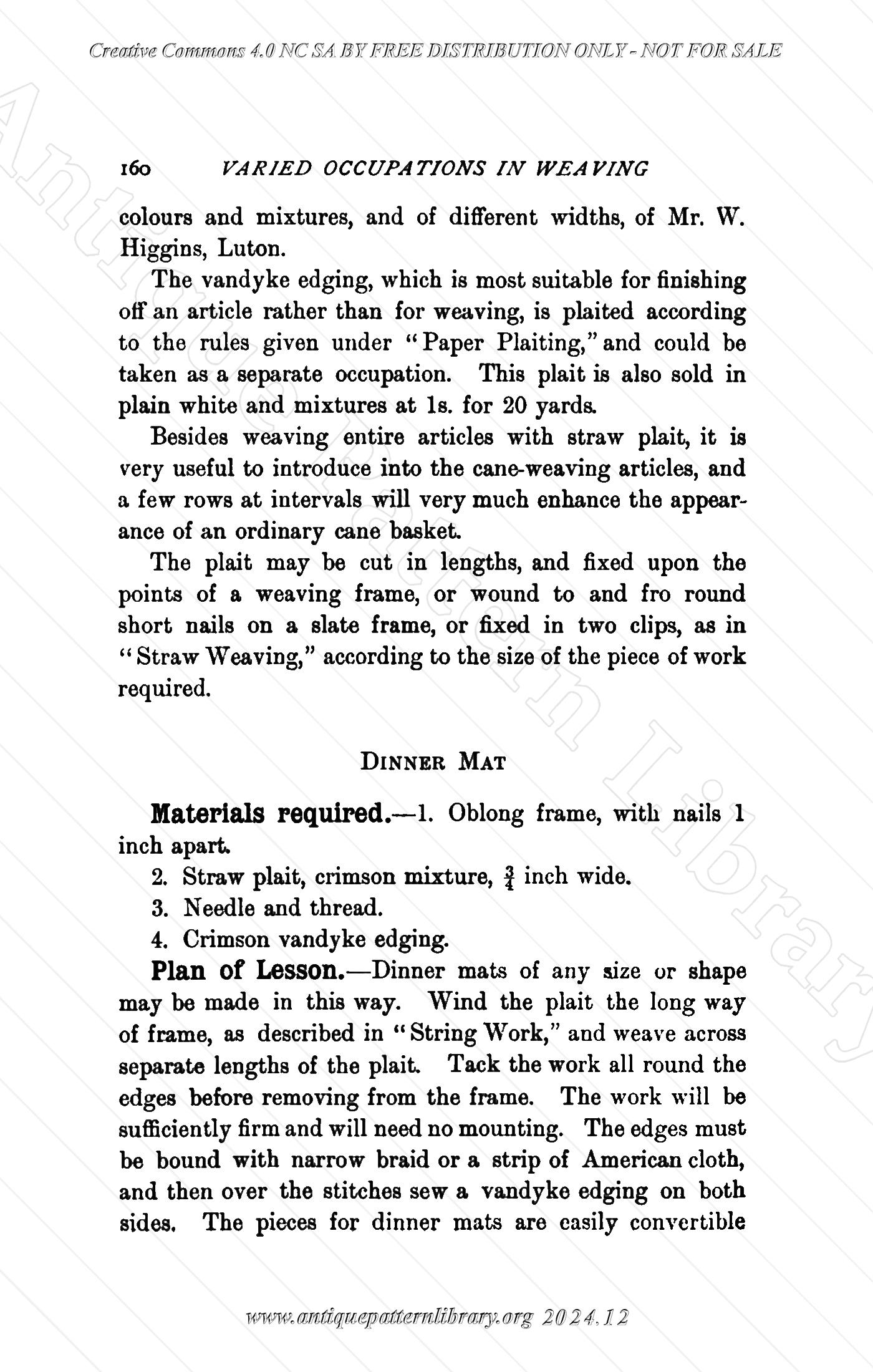Small hardcover bound book, containing instructions on how to teach little children paper plaiting, weaving, chair caning and straw work. Many illustrations. Some sections talk of "children" in general, others are focused on "girls" or "boys". Added instructions on how to make useful and decorative objects from the completed work pieces. Quite useful to help occupying children from kindergarten age at home or in the classroom.