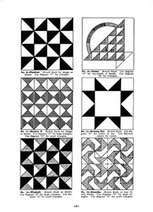 16 pages stapled softcover. Contains 30 quilting designs with the patterns for the patchwork pieces. 1. Small Double Wedding Ring, 2. Double Wedding Ring, 3. Fancy Star, 4. Fancy Flowers, t. Pot of Flowers, 6. Texas Star, 7. Star with Diamonds, 8. Eight-Pointed Star, 9. Pinwheel, 10. Basket, 11. Reverse X, 12. Evening Star, 13. Windmill, 14. Swastika, 15. Maple Leaf, 16. Double Hour Glass, 17. Ornate Star, 18. Jack's Blocks, 19. Eccentric Star, 20. Mosaic, 21. Sea Shells, 22. Dad's Bow Tie, 23. Grandmother's Fan, 24. Sun Flower, 25. Cushion Design, 26. Grecian Star, 27. Cogwheel, 28. Flywheel, 29. Orange Peel, 30. Circle Design. Last page shows nine ways to set quilt blocks together.