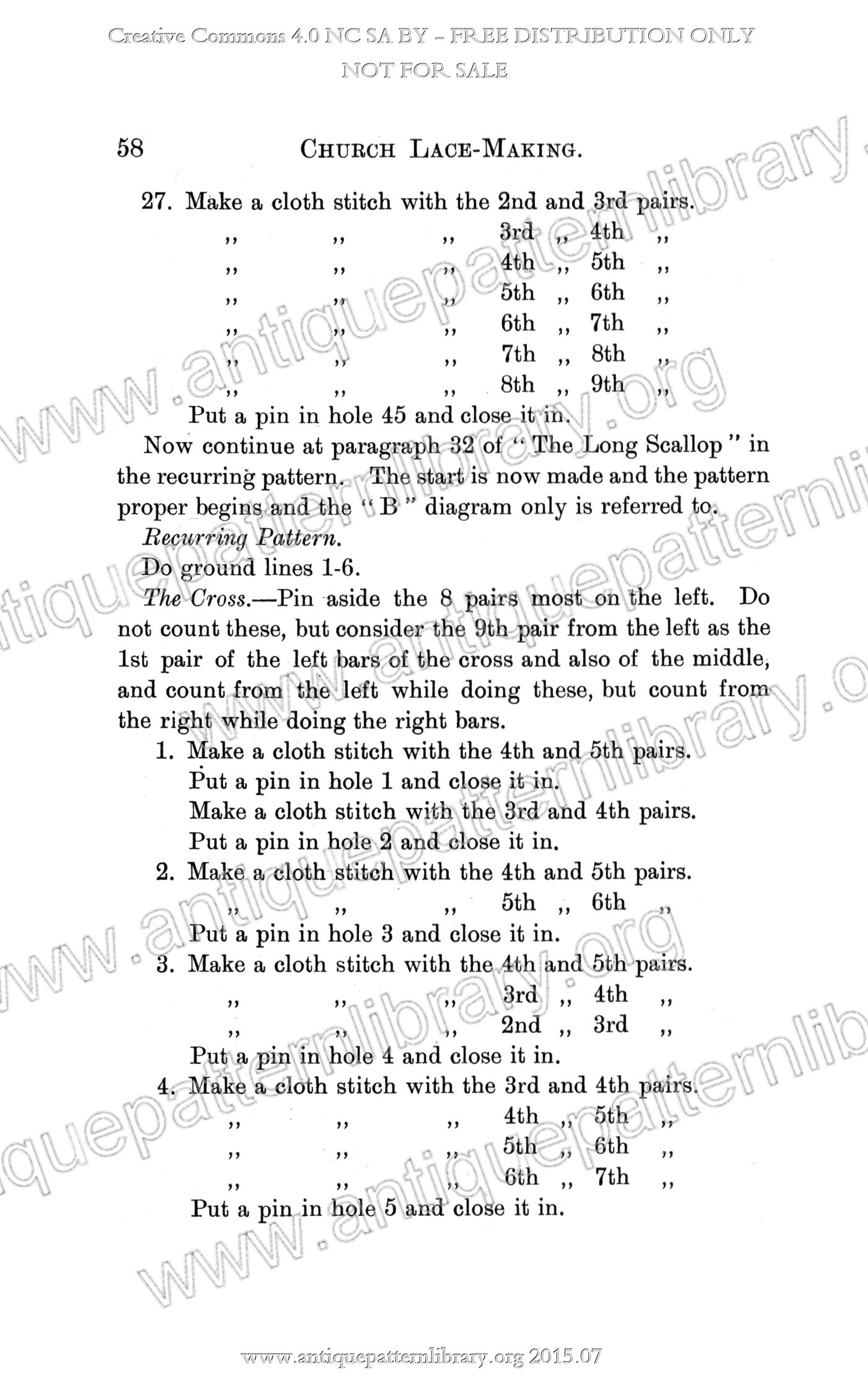 Beginner's introduction to bobbin lace, with eight simple patterns, advancing in complexity. All are clearly described, with bobbin maniuplation guides, plus pinning pattern diagrams. Designs are intended for church linen, and many bear crosses, but some are plain enough for secular use. Nice patterns, doable by non-experts.