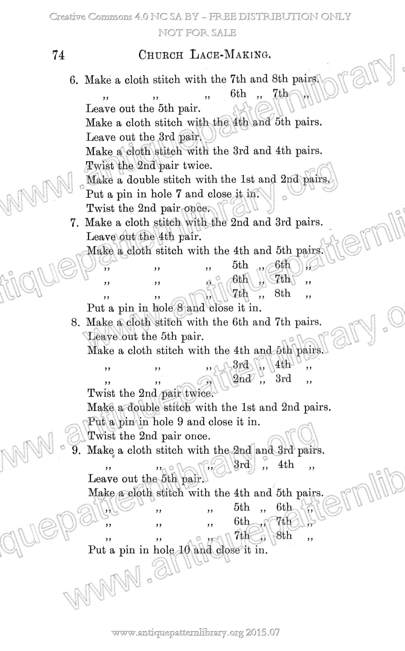 Beginner's introduction to bobbin lace, with eight simple patterns, advancing in complexity. All are clearly described, with bobbin maniuplation guides, plus pinning pattern diagrams. Designs are intended for church linen, and many bear crosses, but some are plain enough for secular use. Nice patterns, doable by non-experts.