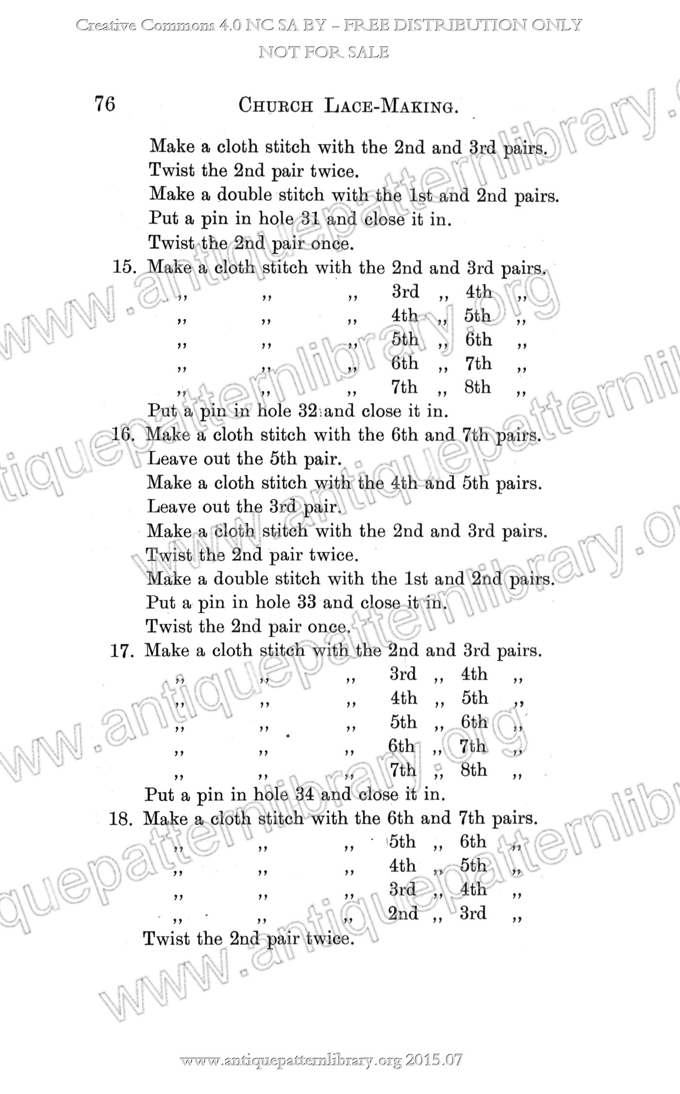 Beginner's introduction to bobbin lace, with eight simple patterns, advancing in complexity. All are clearly described, with bobbin maniuplation guides, plus pinning pattern diagrams. Designs are intended for church linen, and many bear crosses, but some are plain enough for secular use. Nice patterns, doable by non-experts.
