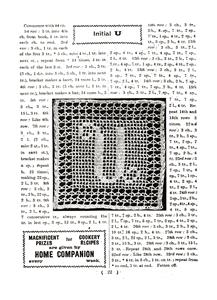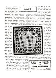 Filet crochet alphabet squares. Booklet compiles the whole series, originally printed one letter each Monday in the Home Companion newspaper. Large photo of each square, with prose instructions. No graphs. Abbreviations used listed on last page.